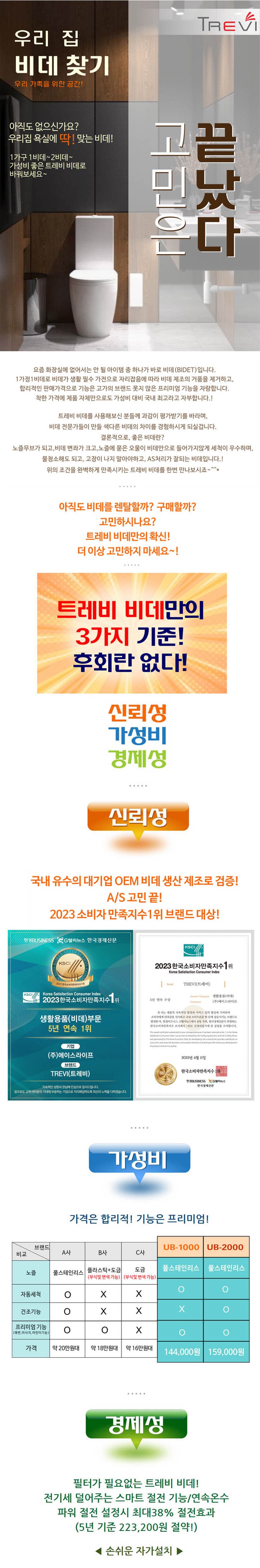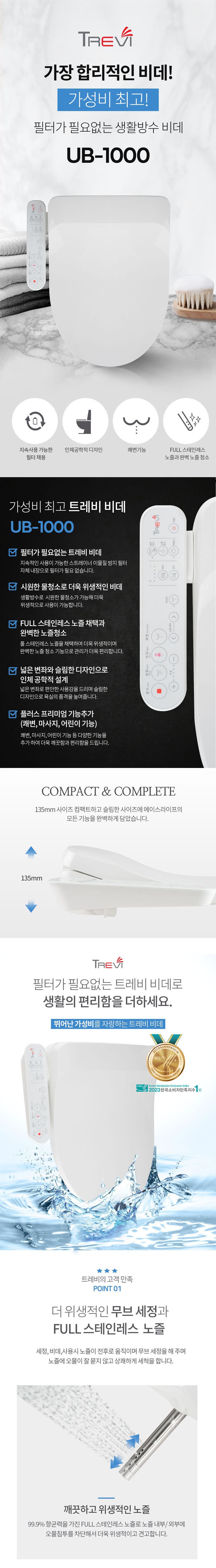 풀스테인리스 노즐 100% 국내 생산★ 필터가 필요 없는 생활 방수 비데로 물청소가 가능해 더욱 위생적이며 풀스테인리스 노즐로 청결함을 더욱 강화했어요~ 플러스 프리미엄 기능(쾌변, 마사지, 어린이 기능)이 추가되어 편리함까지 더한 가성비 좋은 트레비 비데로 더욱 편리한 생활을 경험해 보세요! :D