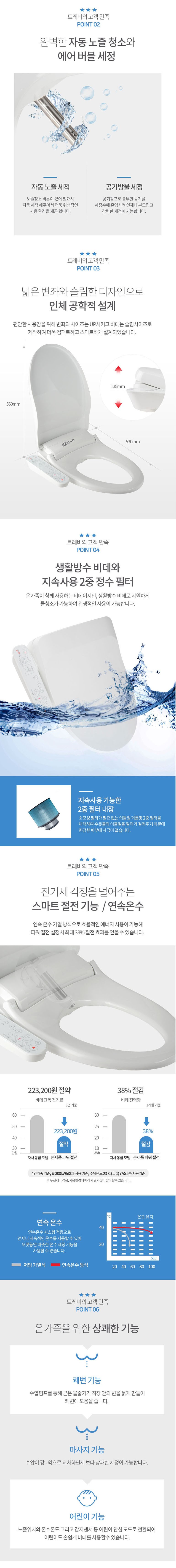 풀스테인리스노즐(항균)/2중필터내장(반영구)/자동노즐청소/어린이기능/절전기능/직수연속온수/IPX-4방수/마사지기능
