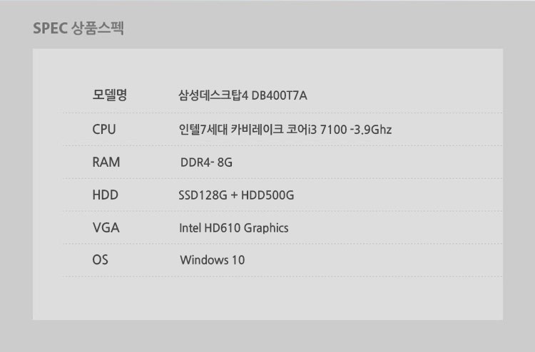 삼성데스크탑4 DB400T7A(인텔 코어i3 7100(3.9GHz)/DDR4 8GB/SSD 128GB/HDD 500GB/인텔HD610/해당없음/윈도10/HDMI/ODD없음)