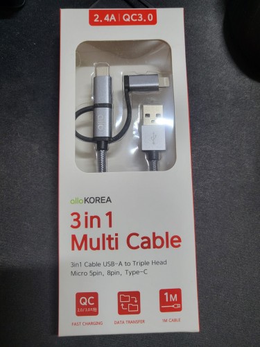 상품명 : 3in1 멀티 충전 케이블 색 상 : 그레이 구성품 : 본품 길 이 : 약 100cm 재 질 : 패브릭, 알루미늄쉘 입력/출력 : 2.4A QC3.0 지원