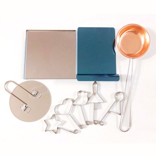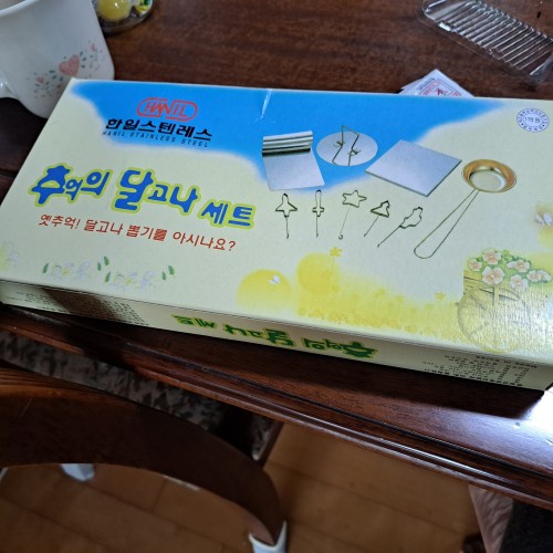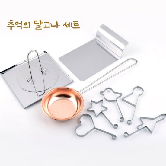 제조사 한일 STS(주) / 제조국 : 국산 / 달고나세트 / 국자, 밑판, 누름판, 끌개, 모형틀 5종 풀세트 구성 / 재질 : 스테인리스 스틸, 동
