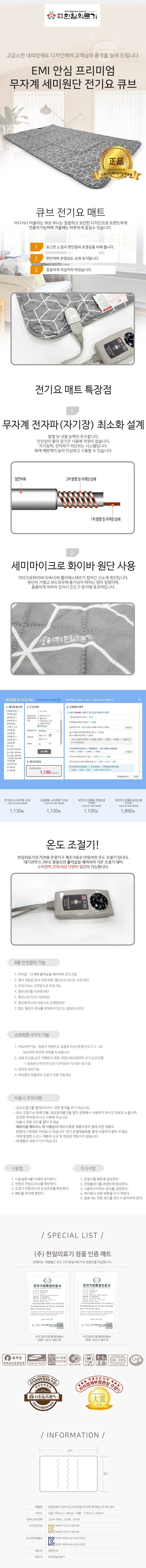 무료배송 / 한일의료기 전기요, 미니싱글 67.5 X 180cm, 싱글 105 X 180cm ,더블 135 X 180cm / 세미 마이크로 고급원단 / 무자계 전자파 / 전자파차단 / 워셔블 / 프리볼트