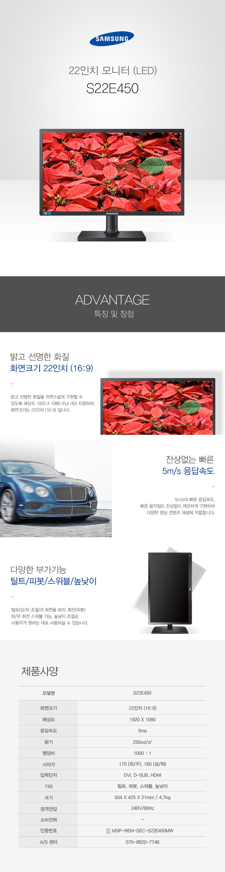 모델명 S22E450 /TN패널/비율 16:9/해상도 1920X1080/응답속도 5ms/밝기 250cd/명암비 1000:1/주사율 60Hz/HDMI단자/틸트/피봇/스위블/높낮이 조정 가능