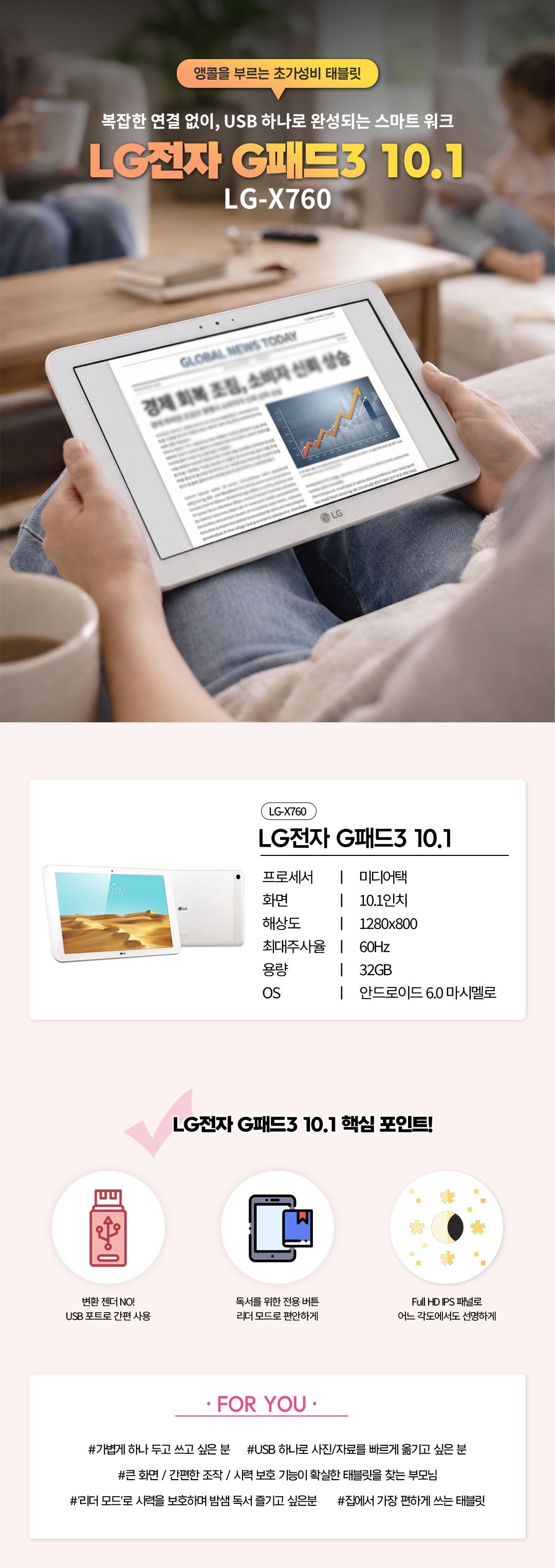 초가성비 6차 앵콜입고★ 고객님들의 성원에 힘입어 추가 물량을 긴급 공수했습니다. 10만 원도 안 되는 저렴한 가격의 믿을 수 있는 대기업 LG전자 태블릿입니다. 500g 정도의 가벼운 무게에 10.1인치 화면을 제공하는 초가성비 제품입니다.
