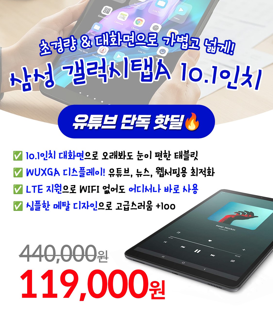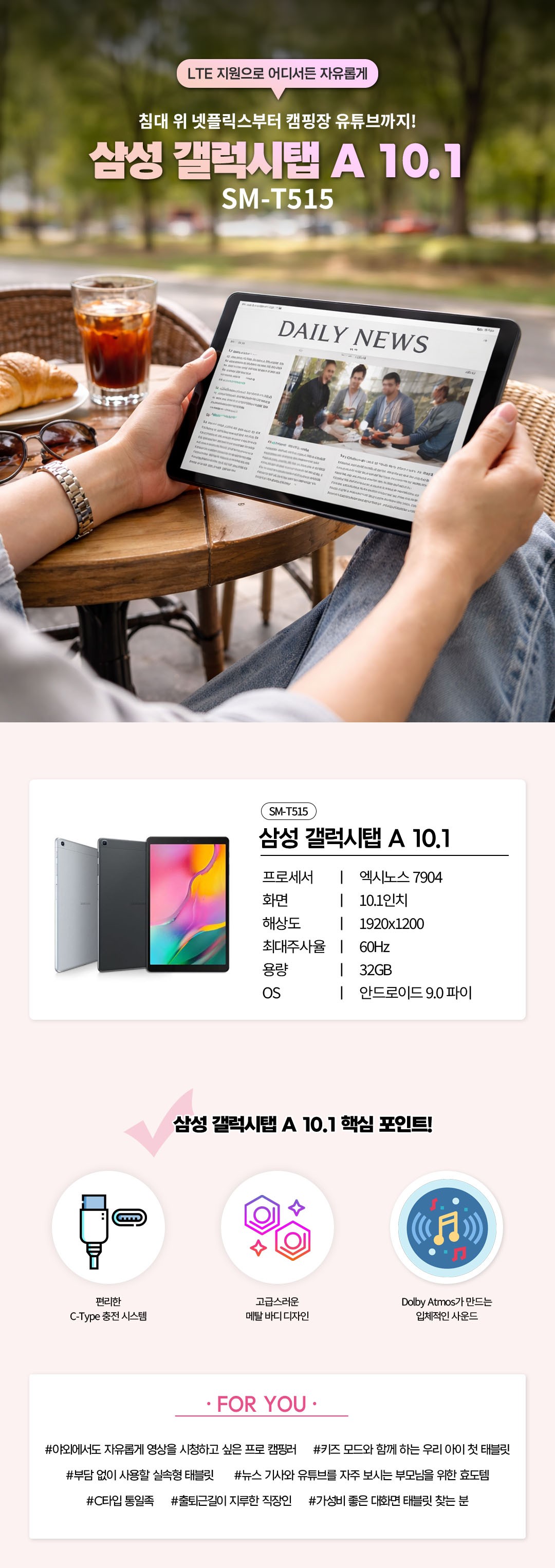 모두에게 사랑받는 삼성 갤럭시탭A 10.1인치 한정 수량을 긴급 입수했습니다♥ 초경량 & 대화면으로 가볍고 넓게! 1920 x 1200 해상도와 WUXGA 디스플레이로 놀라운 색 재현율은 물론이고, 최적의 화면 밝기를 갖추어 유튜브 시청 및 웹서핑 용도로 가볍게 사용하기에 더할 나위 없는 가성비 태블릿입니다!