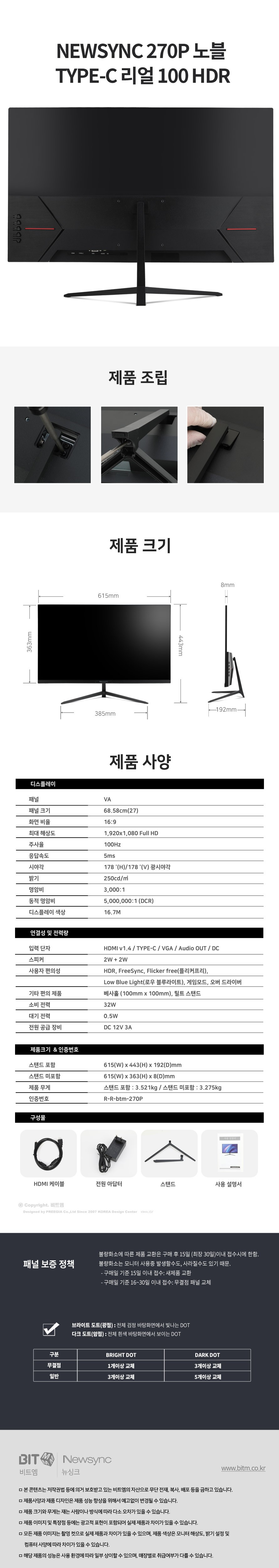 | 모델명 | 비트엠Newsync270P노블TYPE-C리얼100HDR | INCH | 27인치 |