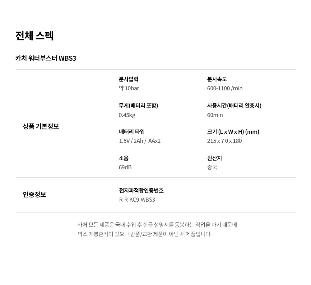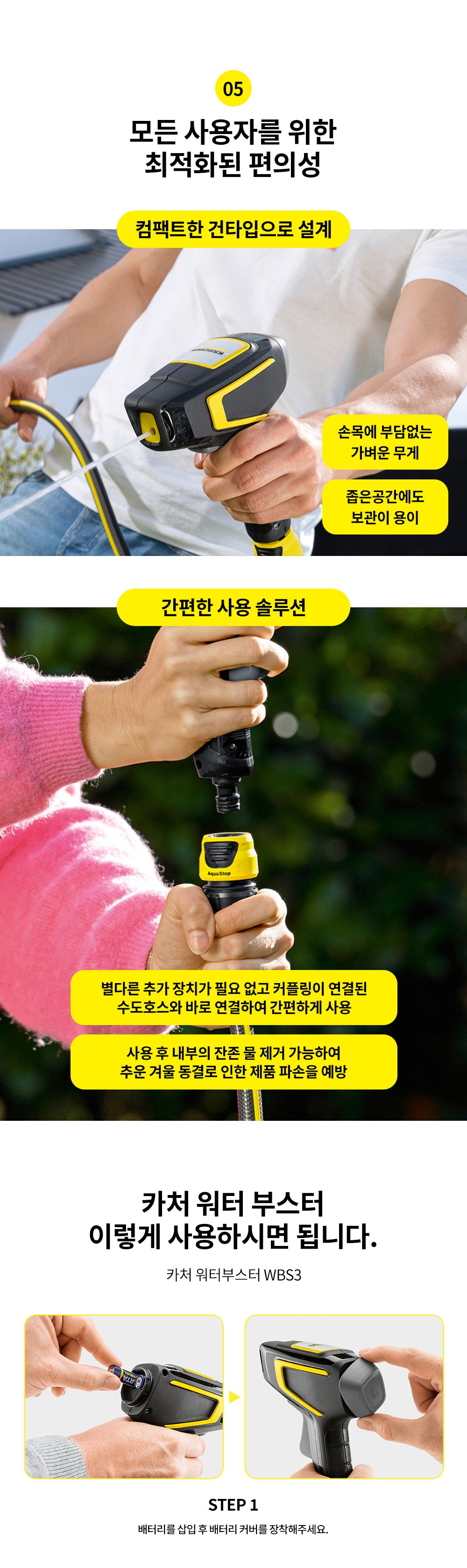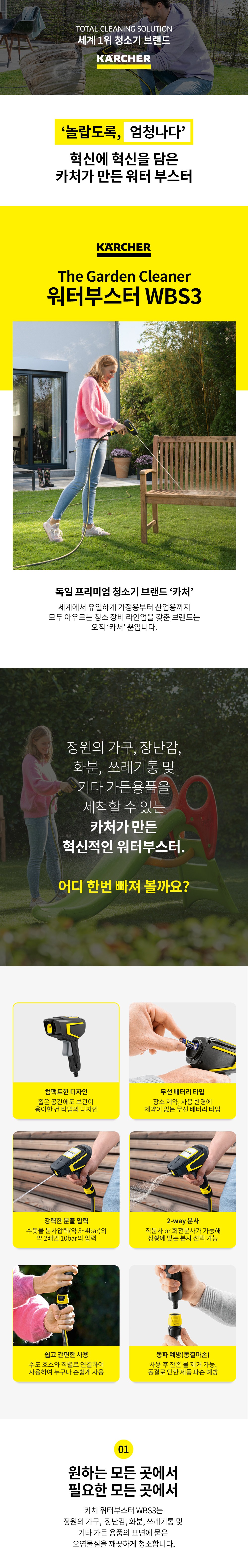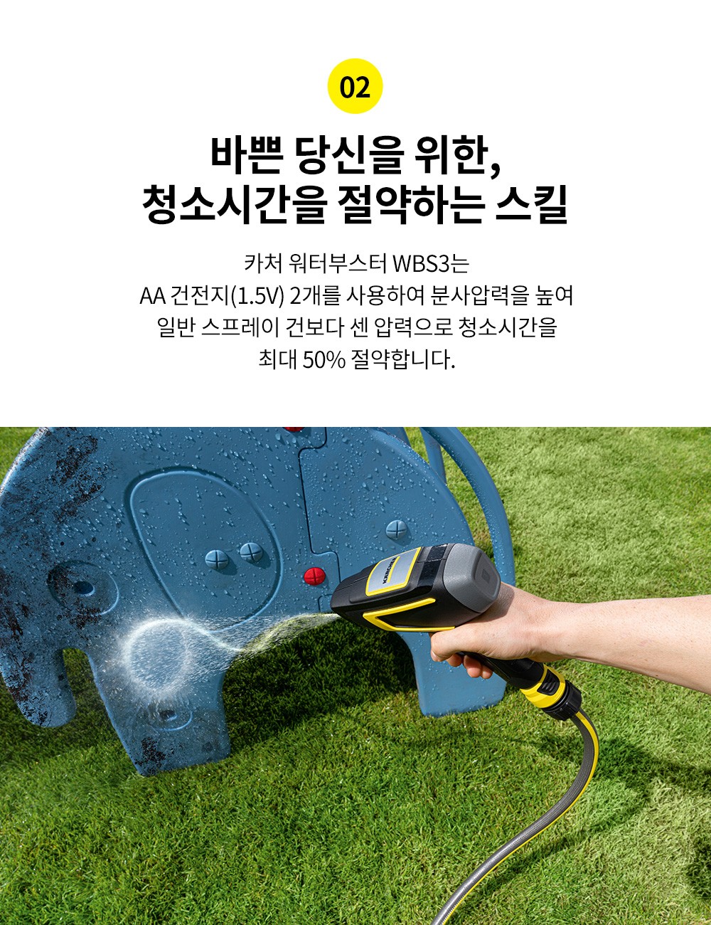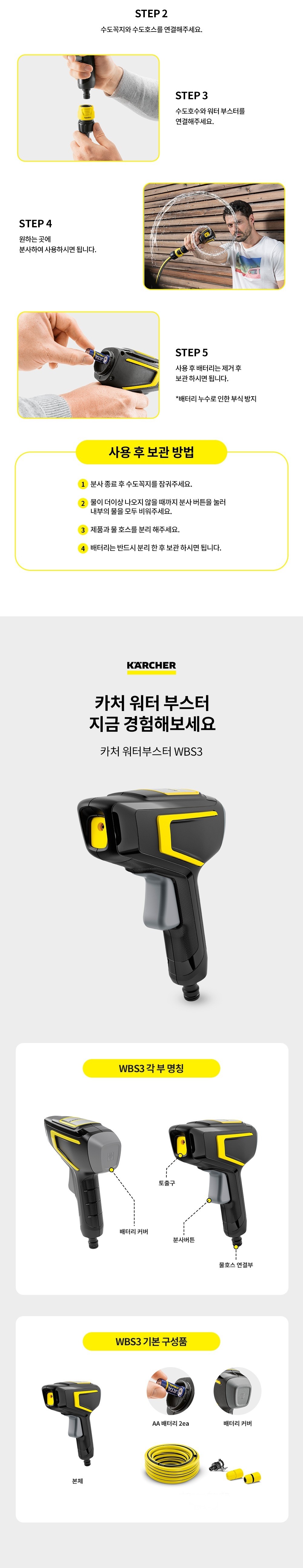 컴팩트한 디자인 / 건전지 AA 2개 타입 / 분사압력 10bar / 2-WAY 분사방식(직분사,회전분사 선택) / 동파예방 / 구성품 : WBS3본체, AA배터리 2ea, 배터리커버+ 수도 10m 호스세트