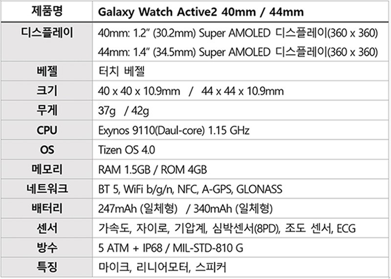 SM-R830,SM-R820(스마트워치 / 화면크기 : 30.4mm(1.2인치) / 블루투스 / GPS / NFC / WiFi / 듀얼(2)코어 / 1.15GHz / 램 : 768MB / 내장:4GB / AOD / 음악제어 / 통화가능 / 사진촬영 / 카메라확인 / SNS알림 / 진동 / 음성인식 / 밀스펙 / 스피커 / 마이크)