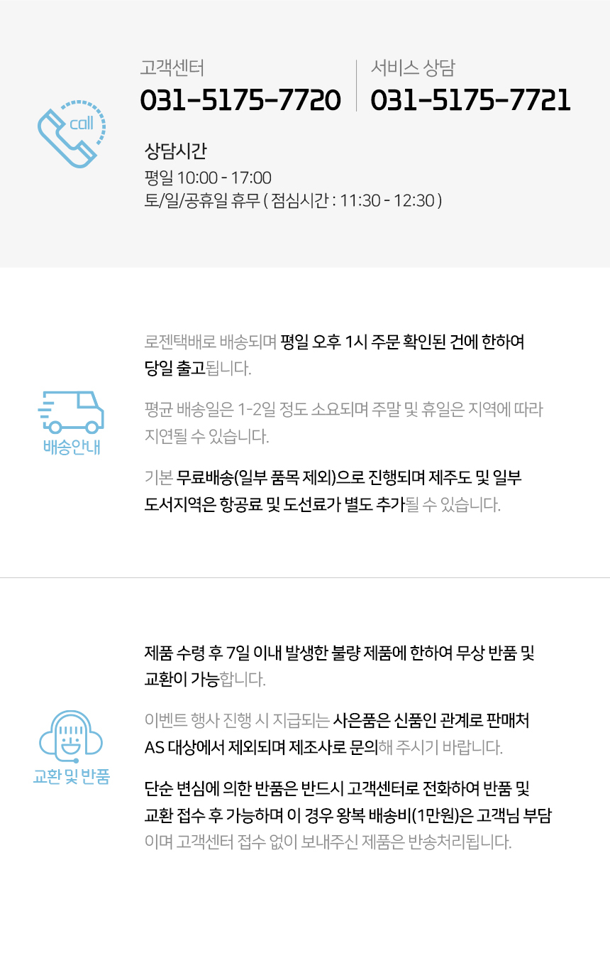 반품, AS, 교환처리시 택배서비스를 이용하여 이루어지고 있습니다. 서비스 이용시 착오없으시기 바랍니다.