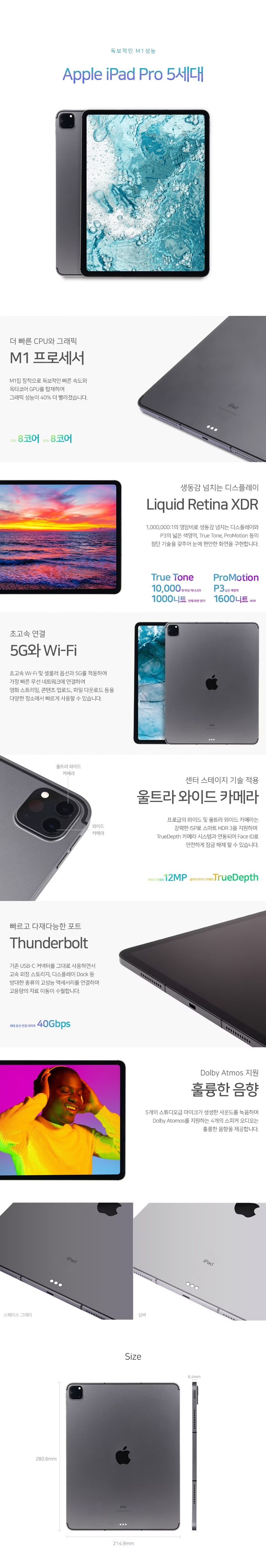 A2461(애플펜슬 별매 / 출시OS: iPadOS 14.5 / 12.9인치 / miniLED / 2732x2048 / 120Hz / 1600nits / APPLE M1 / 8코어 / microSD미지원 / C타입 / 가로: 214.9mm / 세로: 280.6mm / 두께: 6.4mm / 무게: 682g)