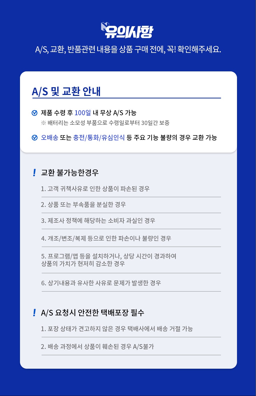 불량증상이 확인되지 않는 경우 왕복택배비용이 발생될 수 있습니다.
