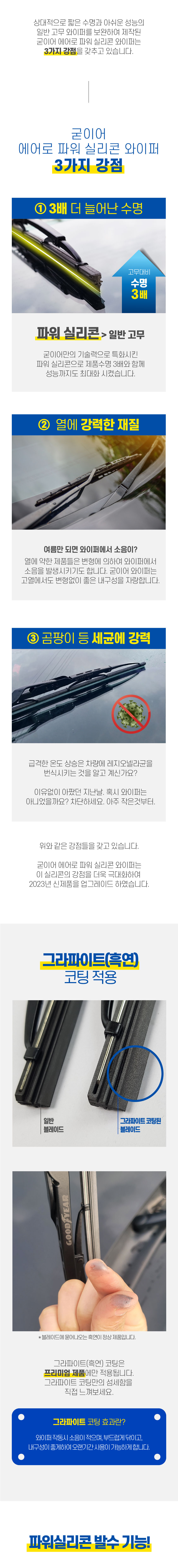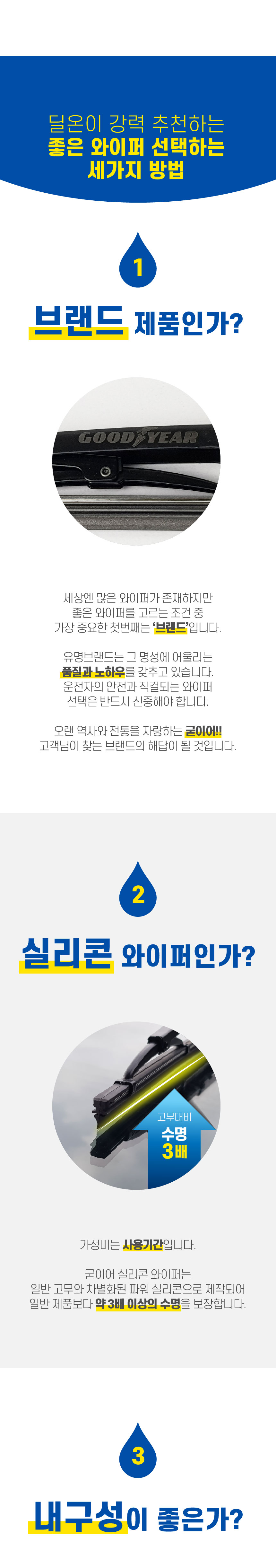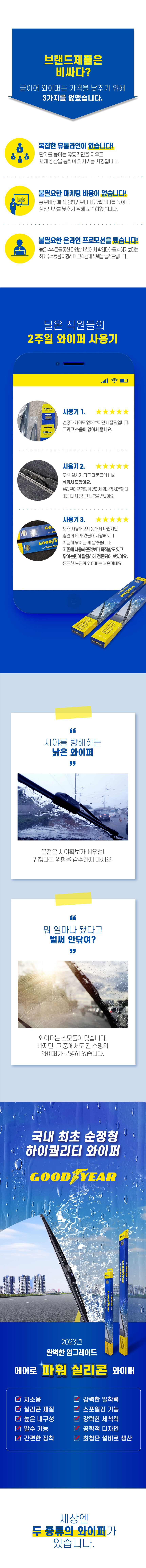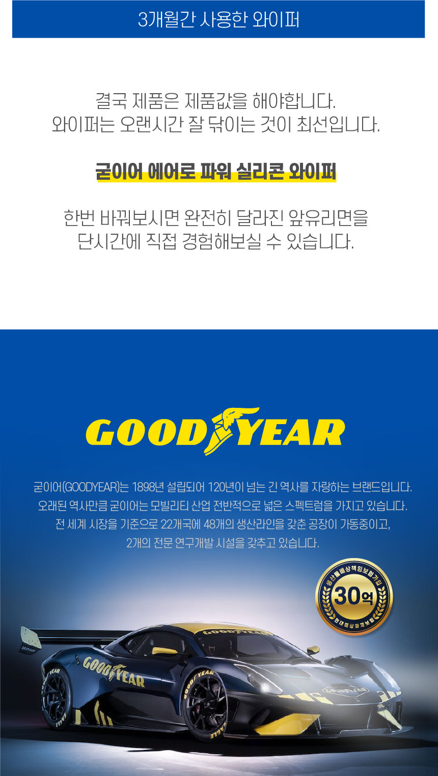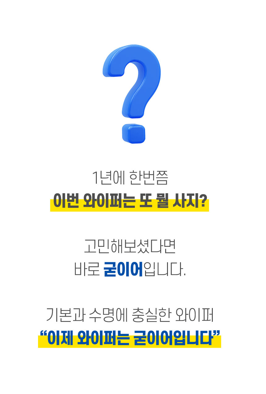1년에 한번쯤, 이번 와이퍼는 또 뭘사지? 고민해보셨나요? 기본과 수명에 충실한 가성비갑 와이퍼 굳이어! 수명3배, 저소음 발수까지~ 완벽한 업그레이드! ★특가 추천!