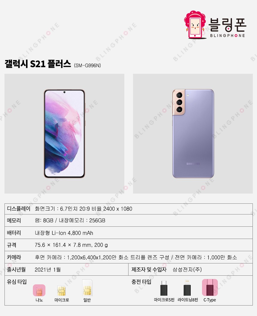 사용하시던 유심 그대로 사용 가능한 6.7인치 넓은 디스플레이과 대용량 배터리 4,800mAh의 스펙을 가지고 있는 삼성 갤럭시S21+입니다. 넓은 화면과 대용량 배터리로 유튜브 시청이나 핸드폰 게임을 즐기시는 분들이라면 강력추천 드립니다.