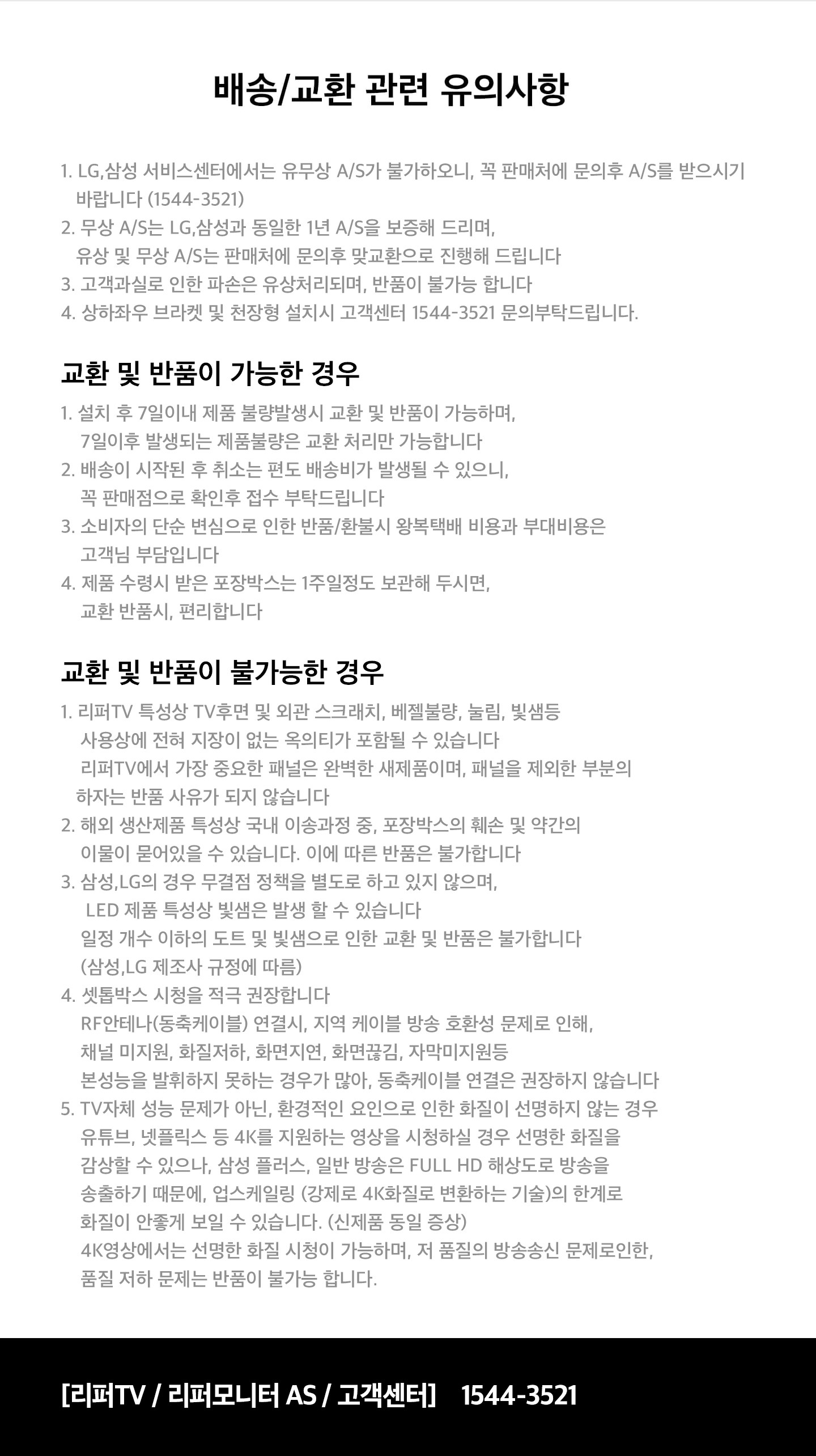 취소 : 제품이 배송되기 전 취소 시 주말/공휴일을 제외하고,1~3일 내에 취소 완료 처리됩니다. 교환/반품 : 제품이 배송/설치된 경우 교환 및 반품은 불가합니다. 단, 제품에 하자가 있는 경우 확인 후 교환 및 반품이 가능합니다.