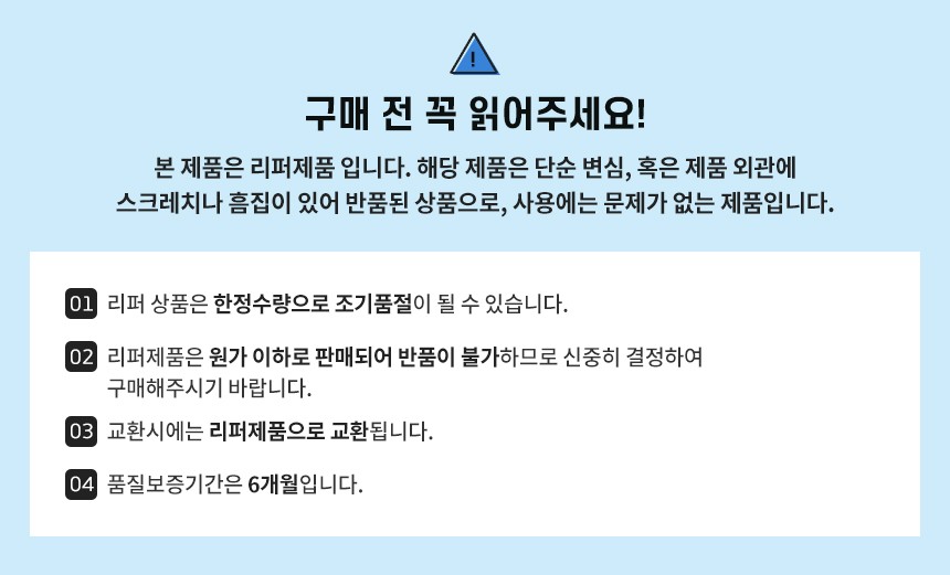 해외리퍼/단기사용/박스개봉 제품의 경우 물류검수 과정에서 외관(바디)에 미세 스크레치가 발생할 수 있으며, 이로 인한 교환 및 단순변심 반품은 불가합니다.