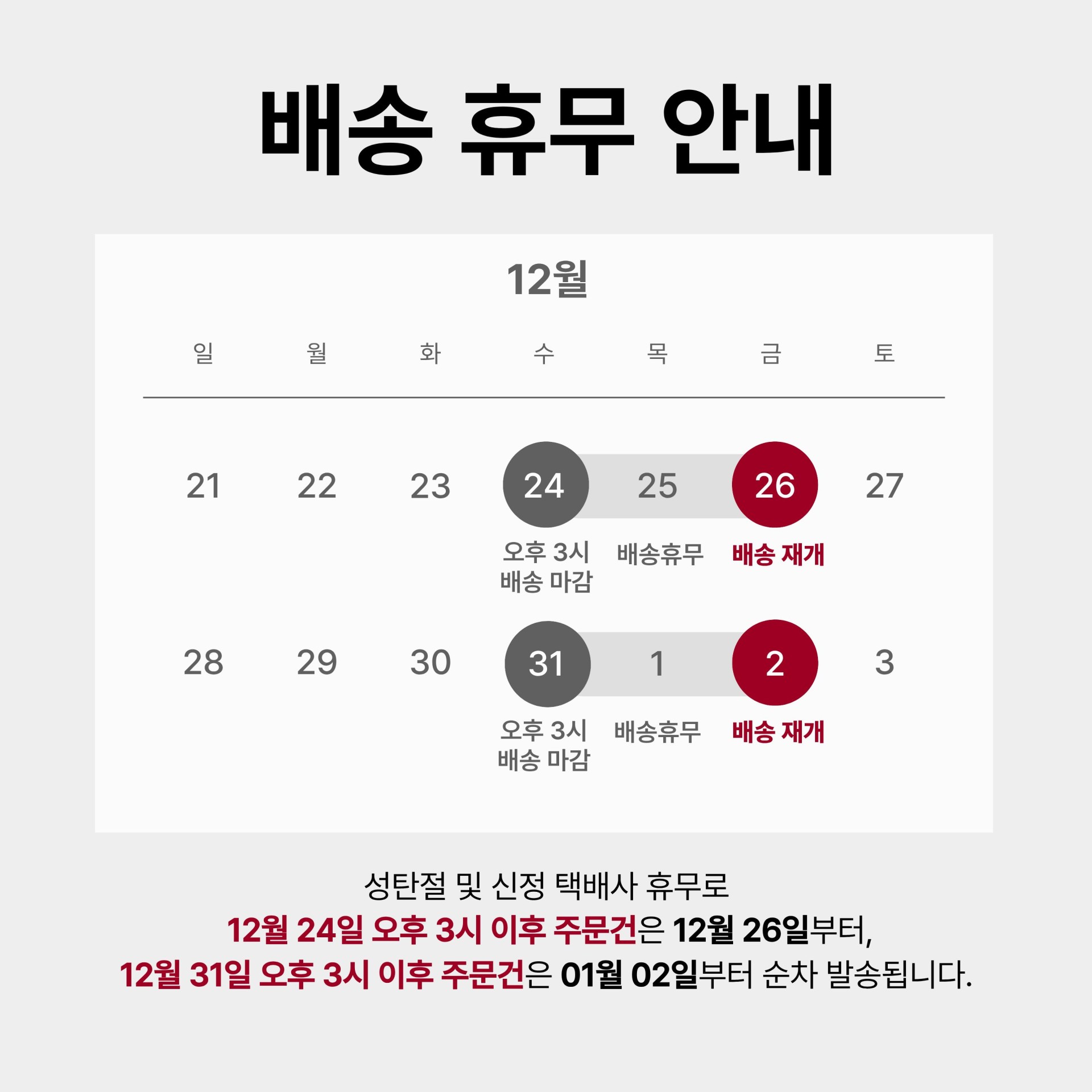 뉴퍼마켓 배송 상품 - 입금 완료 후 1일~2일 이내 배송(출발)됨을 기준으로 하나 주문량이 많은 경우 최대 3일까지 소요될 수 있습니다.