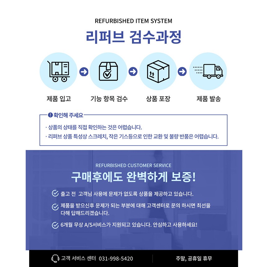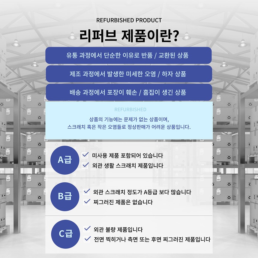 A급리퍼/해외리퍼 제품의 경우 눈에 띄지 않는 미세한 액정 멍, 불량화소로 인한 교환 및 단순변심 반품은 불가합니다.