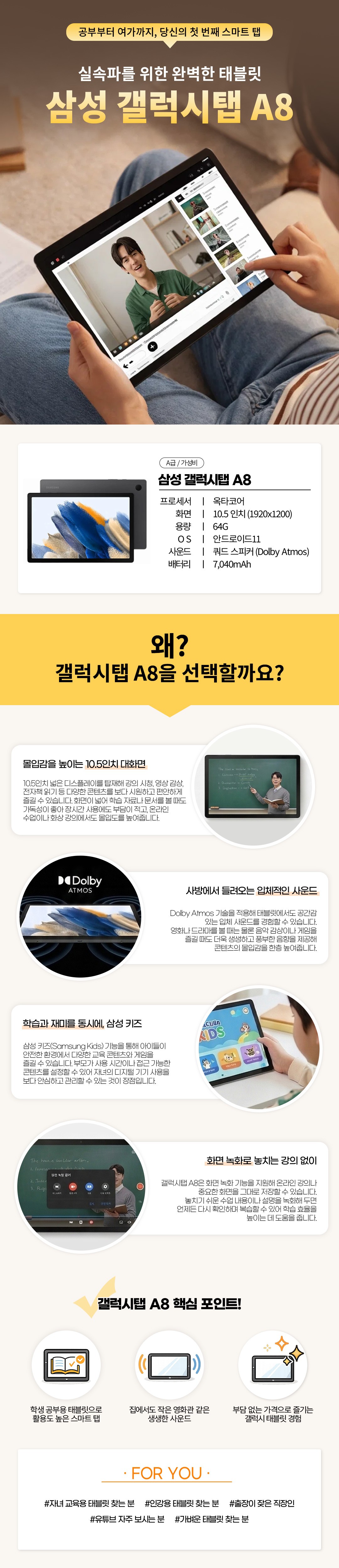 일상의 새로운 기준! 더욱 넓은 세상을 보여주는 선명한 대화면을 지원하는 갤럭시탭A8을 소량 런칭하였습니다. 빠른 품절이 예상되오니 얼른 구매하세요.