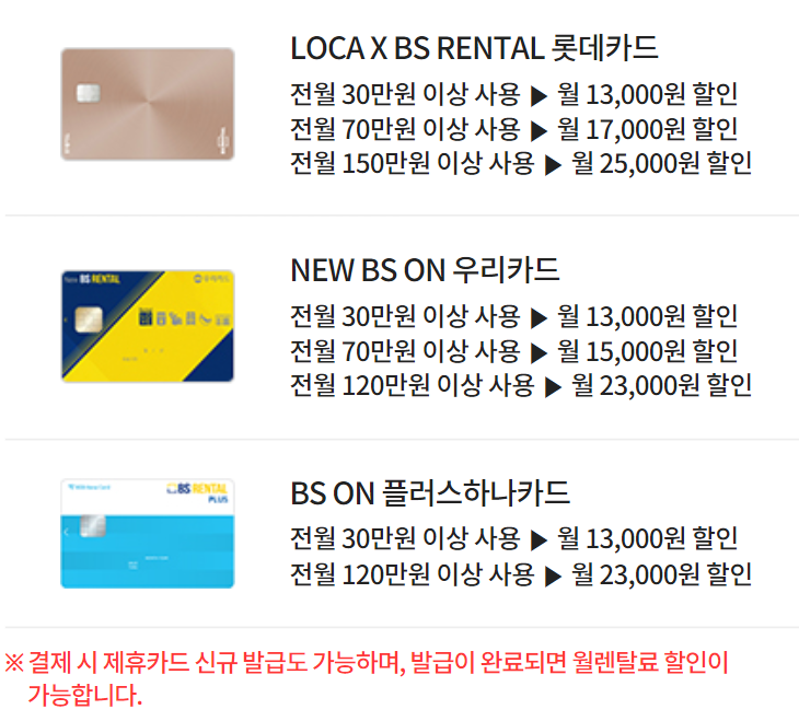 이미 렌탈사 제휴카드를 소지하신 경우, 렌탈 결제정보 입력 시 해당 카드 정보를 입력하시면 할인이 가능하며, 제휴카드가 없으신 경우 렌탈 결제정보 입력 시 제휴카드 신규 발급을 요청하시면 발급 완료 후 할인이 가능합니다.