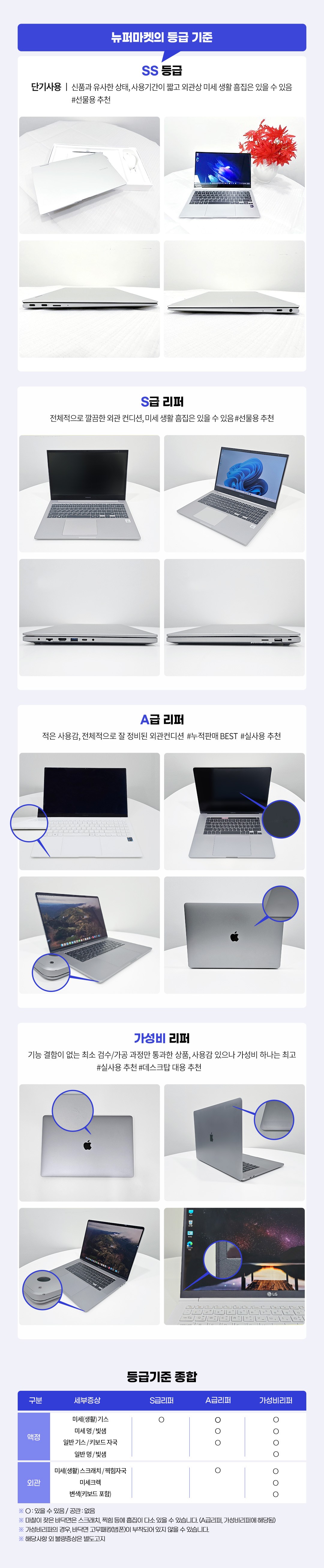 | 가성비 리퍼 | 가격 우선주의! 가격 대비 성능을 우선 고려하여 공정 비용을 최소화하고 그만큼의 가격을 낮춘 상품입니다. 기능상 문제는 없으나 외관상 사용감은 있을 수 있습니다. | |