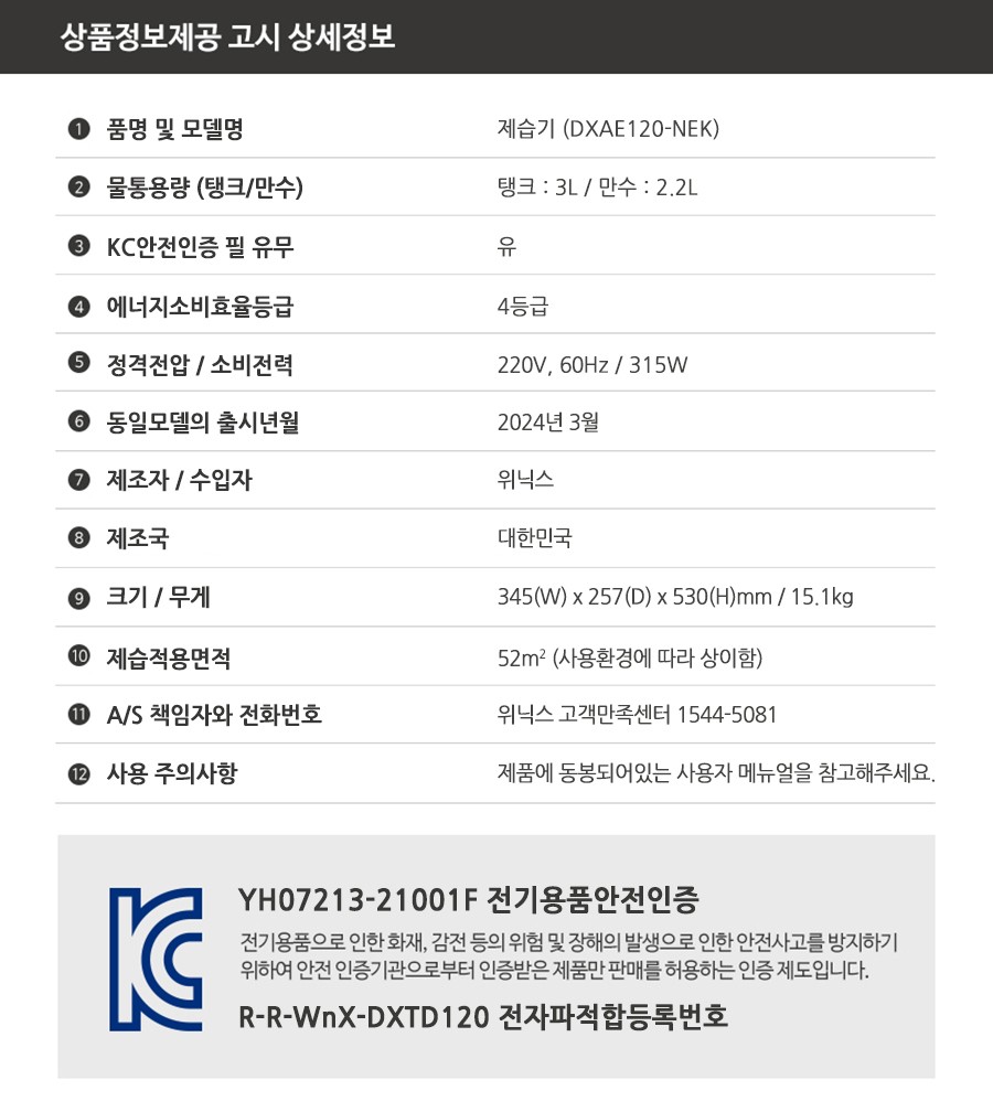 DXAE120-NEK / 제습기 / 일일제습량: 12L / 53㎡(16평) / 물통용량: 3.0L / 에너지효율: 4등급 / 제습효율: 1.73 / 소비전력: 315W / [기능] 연속배수 / 풍량조절 / 만수알림 / 성에제거 / 습도표시 / 습도자동조절 / 수위표시 / 버튼잠금 / 타이머 / 이동손잡이 / 이동바퀴 / 무게: 16.3kg / 크기(가로x세로x깊이): 345x530x257mm / 출시가: 299,000원
