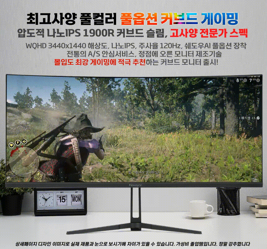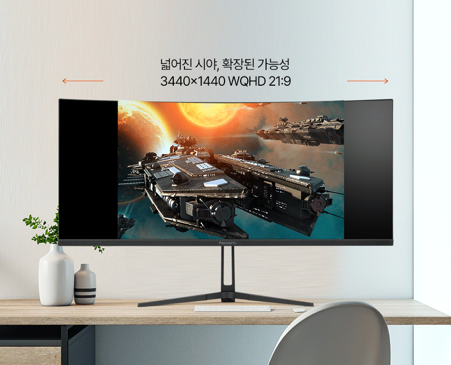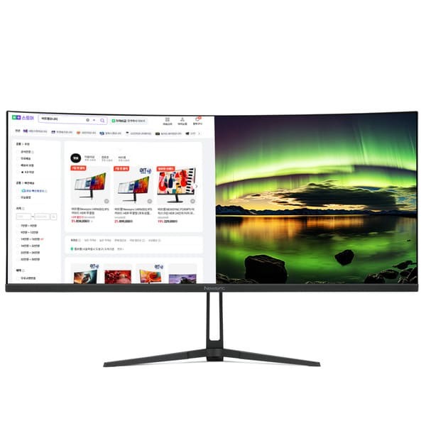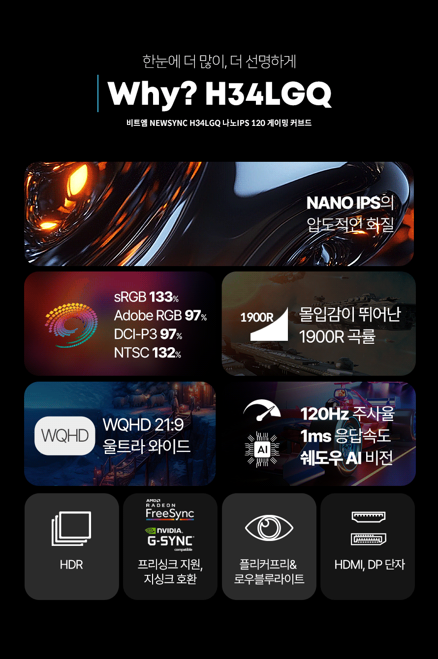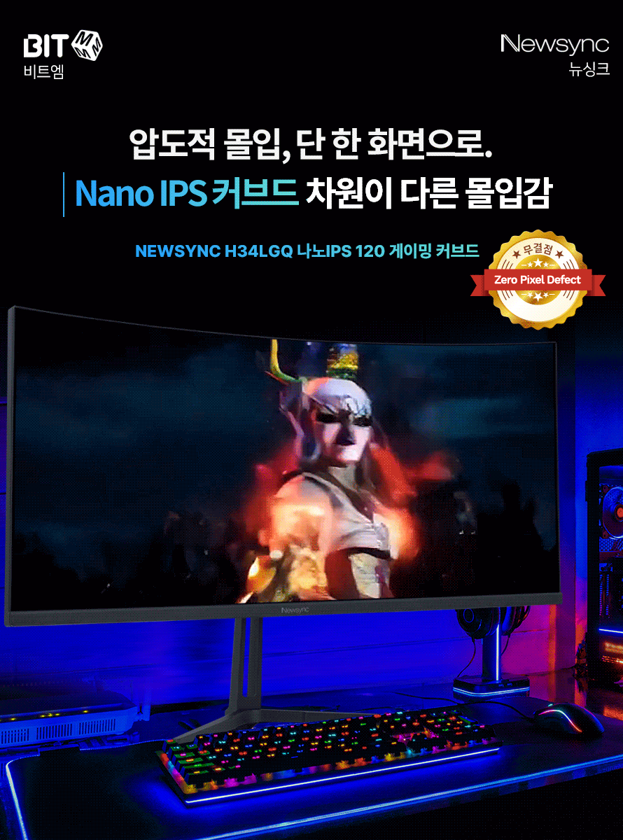 비트엠 Newsync H34LGQ 나노IPS 120 게이밍 커브드 무결점 (86cm(34인치) / 3440 x 1440(Ultra WQHD) / 120Hz / Nano-IPS / 울트라와이드(21:9) / 커브드 / 1900R / 1ms(OD) / 300cd / 2,000:1 / 헤드폰 아웃 / LED 조명 / 틸트(상하) / 베사홀 : 100 x 100mm / 6.64kg / [색상영역] 10bit (8bit + FRC) / sRGB : 132% / Adobe RGB : 97% / DCI-P3 : 97% / NTSC : 132% / [게임특화] 조준선 표시 / G-Sync 호환 / FreeSync / [단자정보] HDMI 2.0 / DP 1.4)
