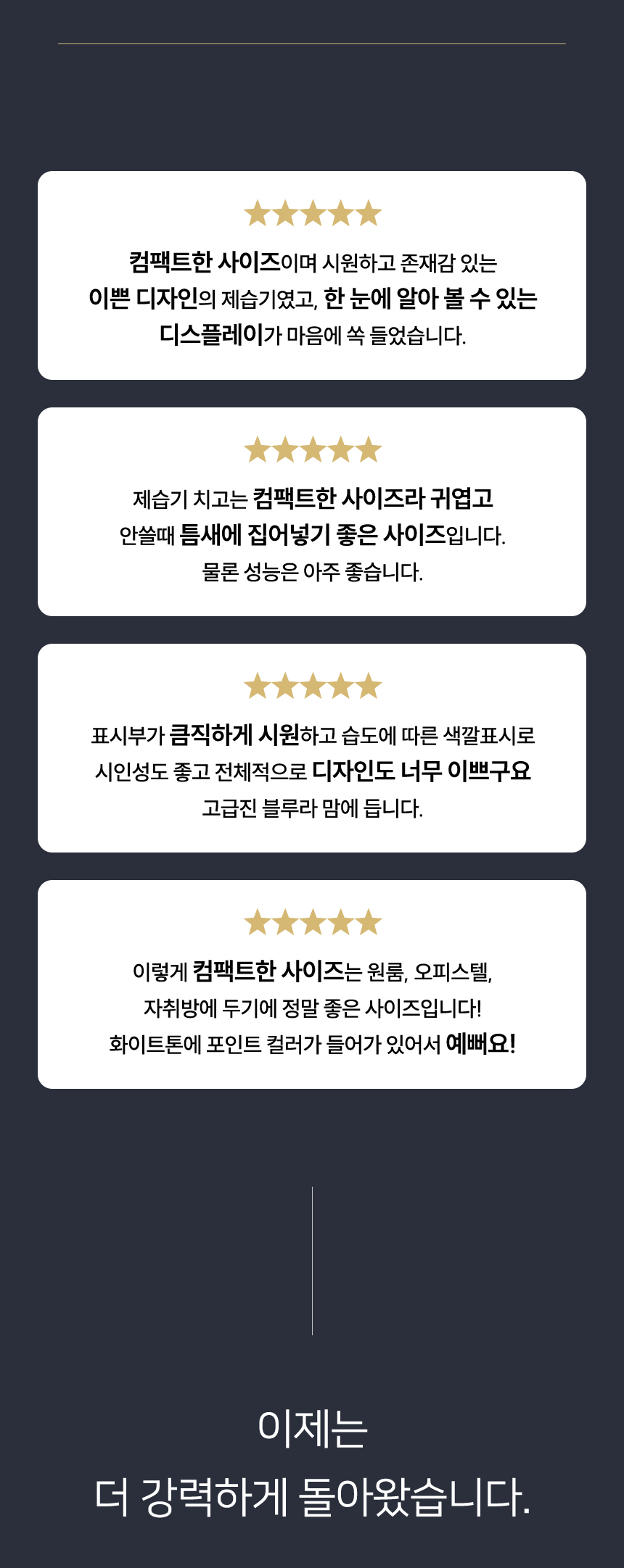 위생/주방가전은 소비자 사용으로 인해 상품의 가치가 뚜렷하게 떨어진 경우 단순변심 환불이 불가합니다.
