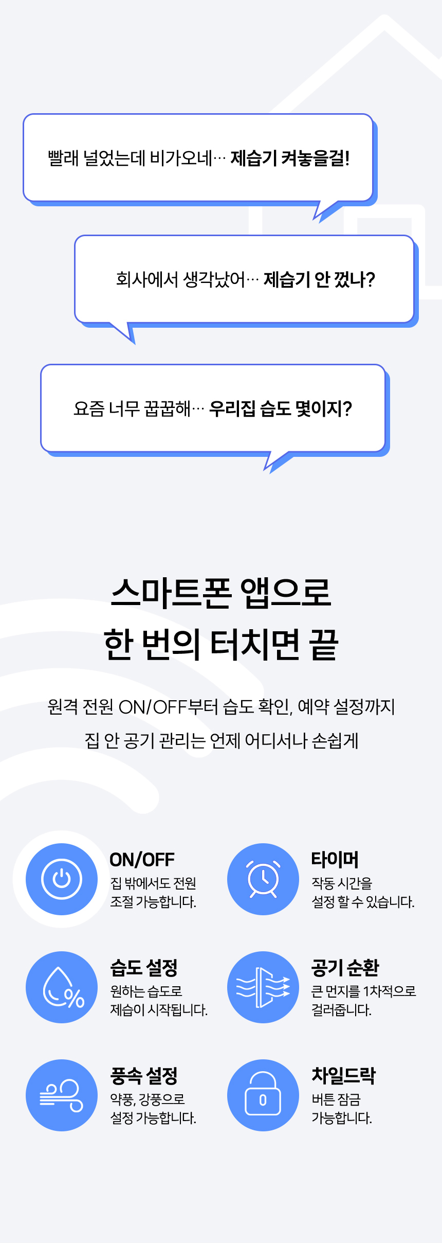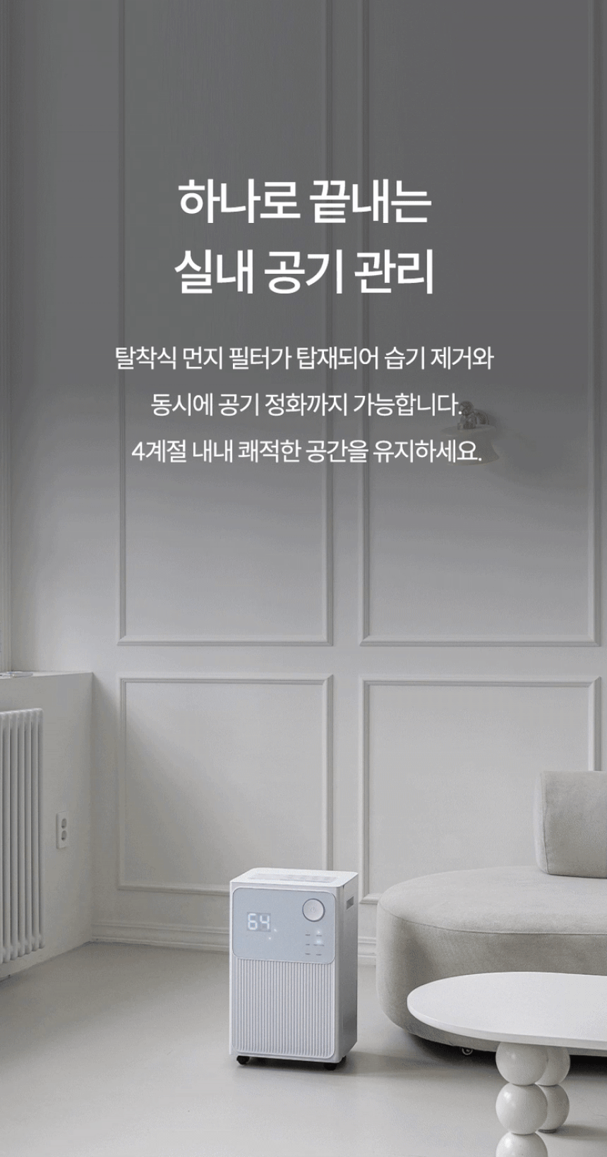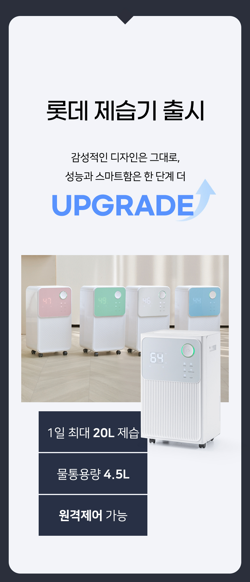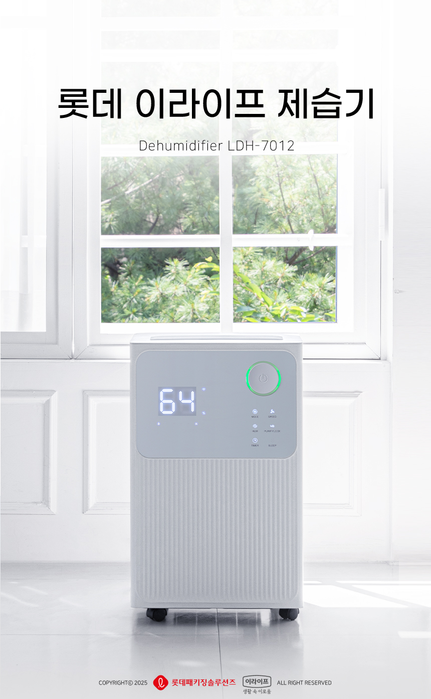 수치로 입증된 국민 제습기★ 감성적인 디자인은 기본, 성능과 스마트함은 한 단계 더! 스마트홈의 완성, 이제 습도까지 내 손안에! 저전력 모터로 전기료 걱정은 줄이고, 장마철 대비는 완벽하게! 지금, 롯데 제습기를 최저가로 만나보세요.