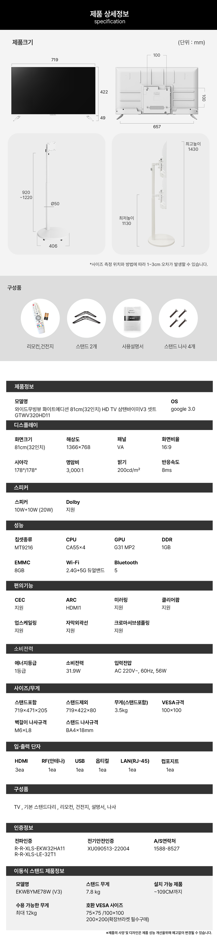 블랙, 화이트, HD, 삼탠세트/32인치