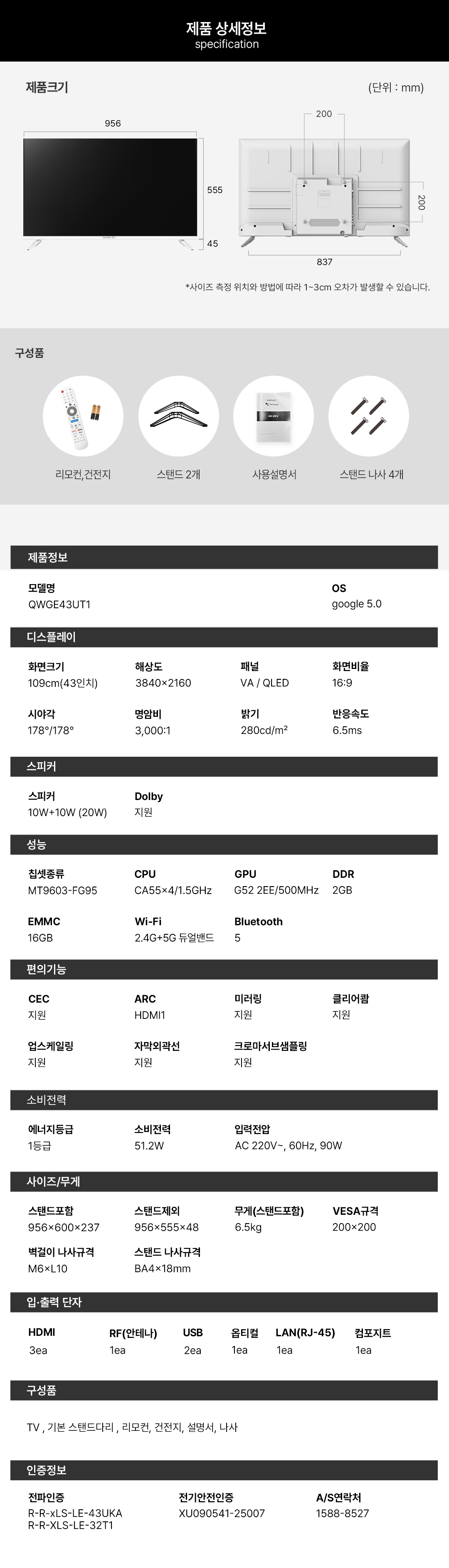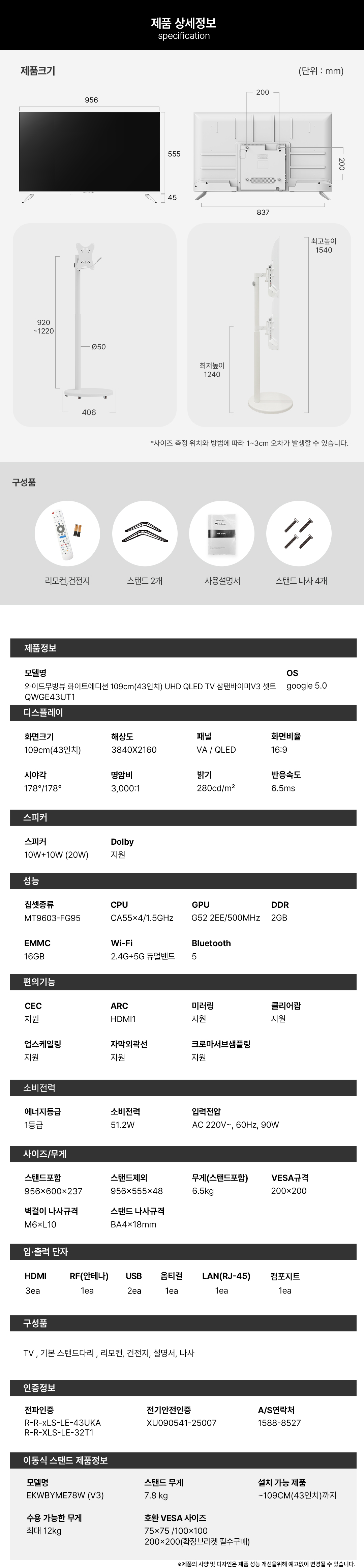 블랙, 화이트, QLED UHD, 삼탠세트/43인치