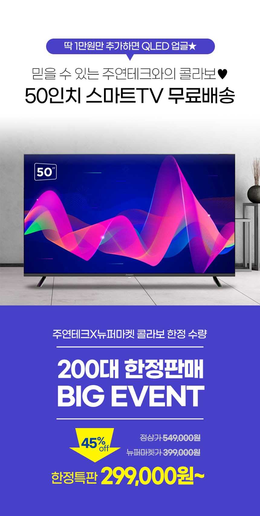 7개월만에 다시 돌아온 뉴퍼마켓X주연테크 콜라보 슈퍼 특가 구성 상품! 50인치 브랜드 TV를 20만원대에 구매할 있는 마지막 기회! 잔여물량이 얼마 안남았어요ㅠ,ㅠ 망설이면 품절! 지금 바로 만나보세요.