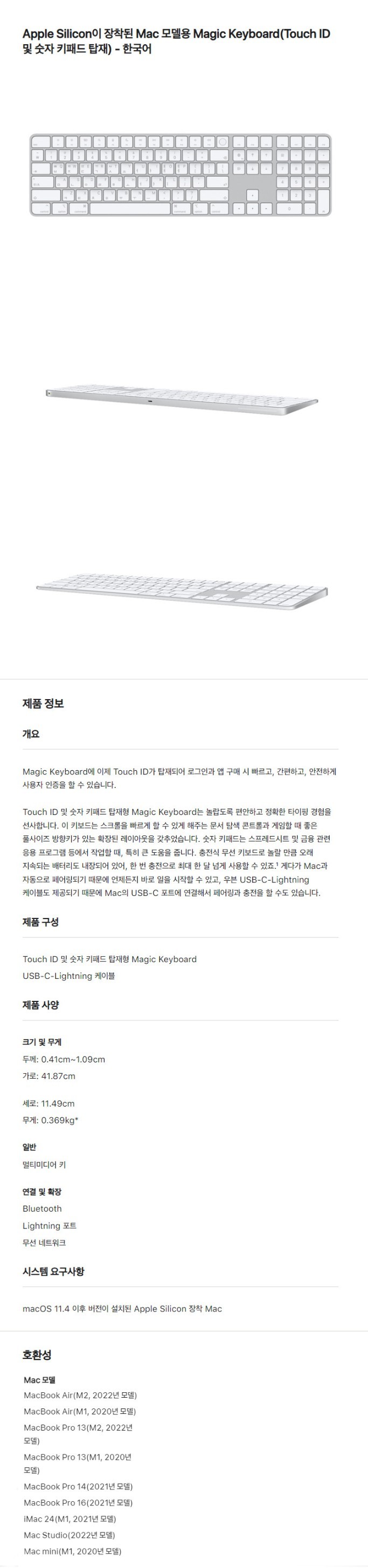 MK2C3KH/A 매직키보드 / ※ 본 키보드는 Touch ID 기능이 탑재되어 있으나, Touch ID는 **Apple Silicon(M1/M2/M3 등) 기반 Mac에서만 사용 가능합니다. 인텔 기반 Mac에서는 일반 키보드 기능만 사용 가능하오니 참고 바랍니다.