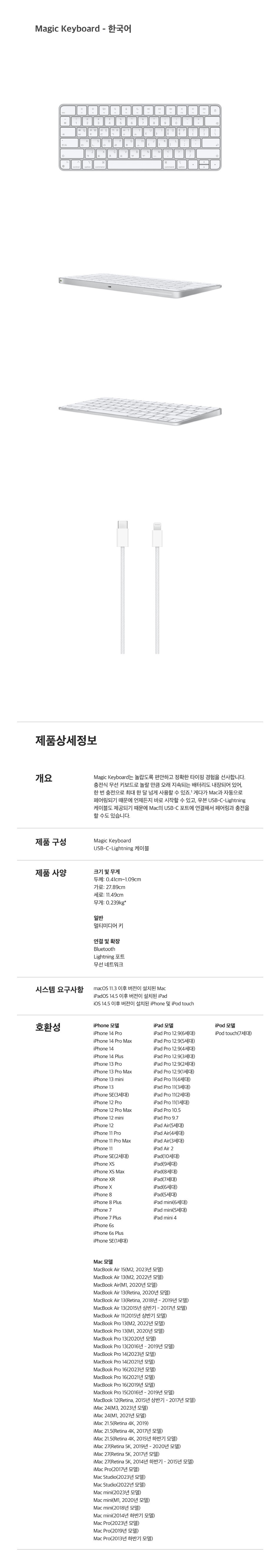MK2A3KH/A / 키보드 / 미니 / 유선+무선 / 펜타그래프 / 78키 / 블루투스 / 내장 배터리 / 숫자키없음 / 블록형 / 한/영 정각 / 멀티미디어 / 직조(패브릭) 케이블 / 착탈식 케이블 / 가로 : 278.9mm / 세로 : 114.9mm / 높이 : 10.9mm / 239g