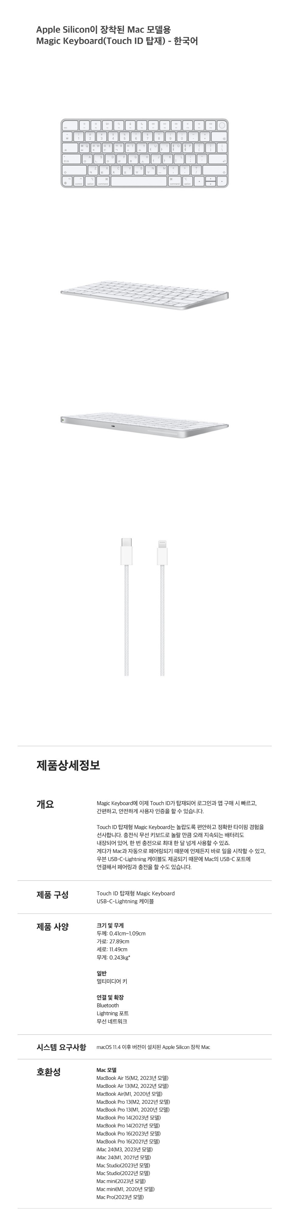 MK293KH/A 매직키보드 / ※ 본 키보드는 Touch ID 기능이 탑재되어 있으나, Touch ID는 **Apple Silicon(M1/M2/M3 등) 기반 Mac에서만 사용 가능합니다. 인텔 기반 Mac에서는 일반 키보드 기능만 사용 가능하오니 참고 바랍니다.