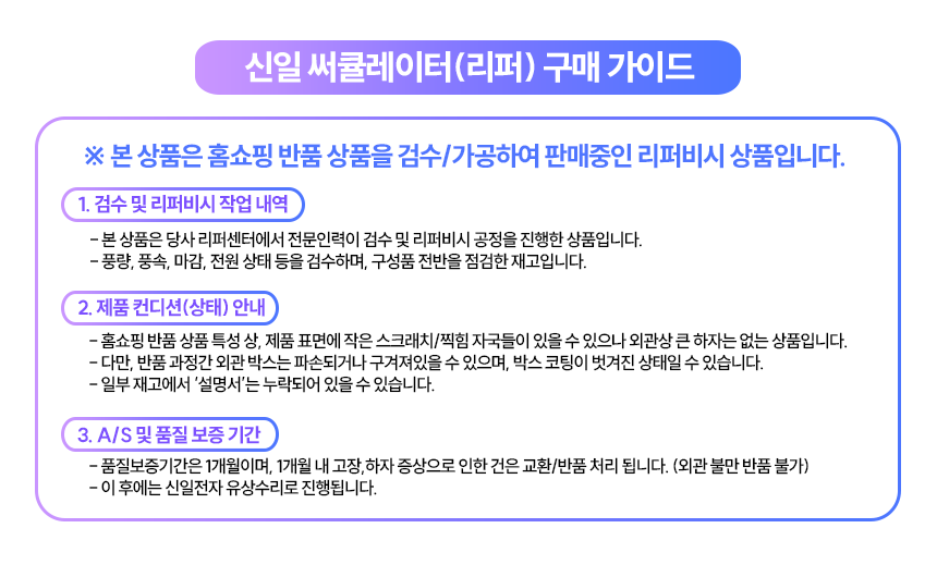 리퍼 제품의 경우 최상의 상품을 제공해 드리기 위해 철저한 검수과정을 거치므로 배송일이 추가 소요될 수 있는 점 양해 부탁드립니다.