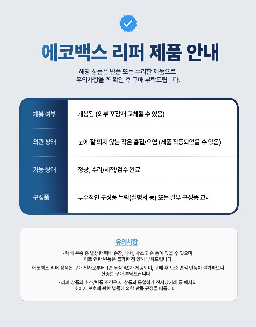 리퍼 제품의 경우 최상의 상품을 제공해 드리기 위해 철저한 검수과정을 거치므로 배송일이 추가 소요될 수 있는 점 양해 부탁드립니다.