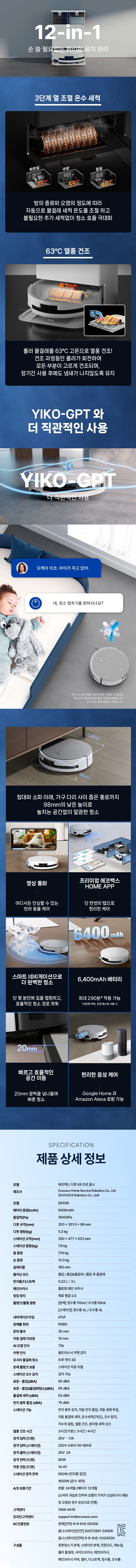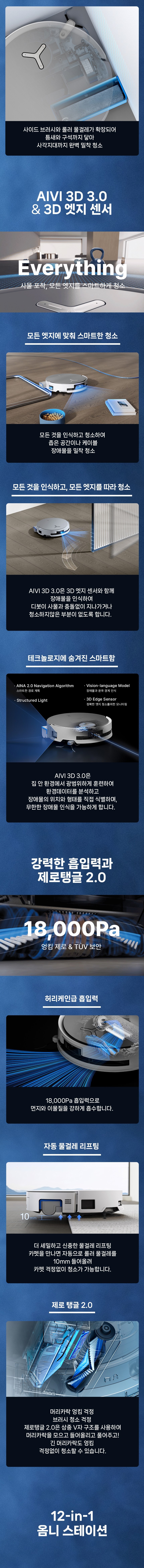 로봇청소기 / 흡입+물걸레 / 흡입력 : 18,000Pa / 센서 : ToF , 3D인식 , 카메라 , 측면 / 맵핑 : 2D , 복층 / AI사물인식 / 장애물회피 / 문턱등반 / 오염도감지 / 스테이션 : 먼지비움 , 걸레세척(온수) , 걸레건조(온풍) , 세제투입 , 자동충전 / 문턱넘기 : 2cm / 통과높이 : 10cm / [흡입/물걸레] 브러쉬 : 메인 , 사이드로봇브러쉬 , 엉킴방지재질 / 사용시간 : 4시간50분(최대) / 물걸레리프팅 / 진공후물걸레 / 물걸레 : 롤러형 / 물걸레확장암 / 색상 : 화이트 / 무게 : 5.3kg / 크기(가로x세로x깊이): 청소기 353x98x351.5mm 스테이션 350x533x477mm