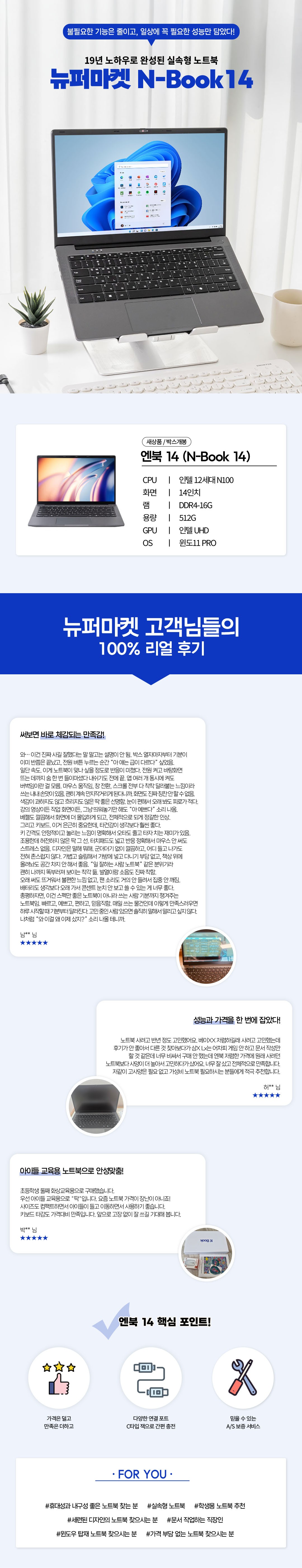 누구나, 어디서든 부담없이! 뉴퍼마켓의 19년 노하우로 완성된 '실속형 노트북'의 정석, 앤북(NBook)을 선보입니다~★ 품질과 안정성은 더욱 더 철저하게 검증 완료~ 불필요한 기능은 줄이고, 인터넷 강의 · 문서 작업 · OTT 시청 등 일상에 필요한 성능만 담았습니다. 지금 엔북14 런칭기념 특가 이벤트 중으로 해당 기간 동안 구매하시면 램16G/SSD 512G 더블 업그레이드 이벤트를 진행하고 있습니다 :D