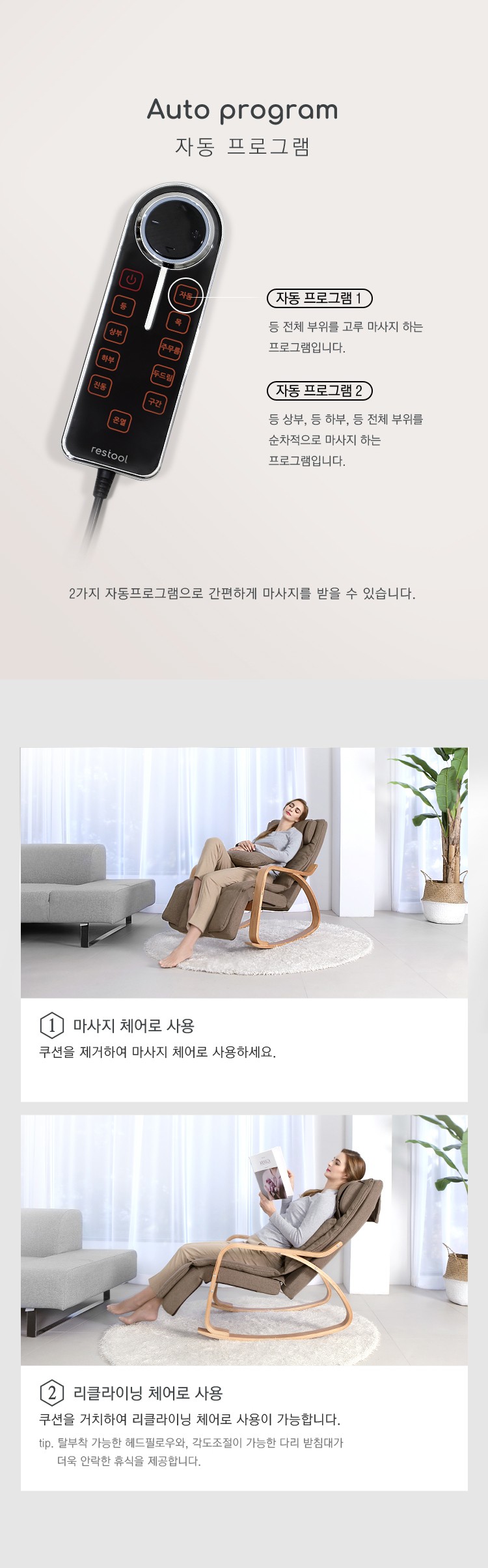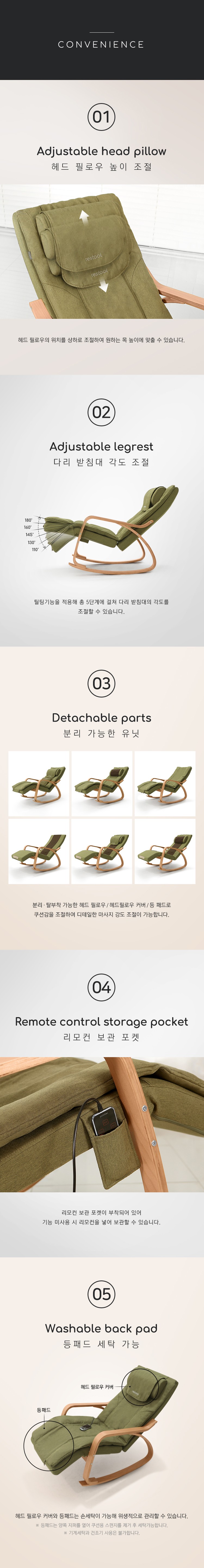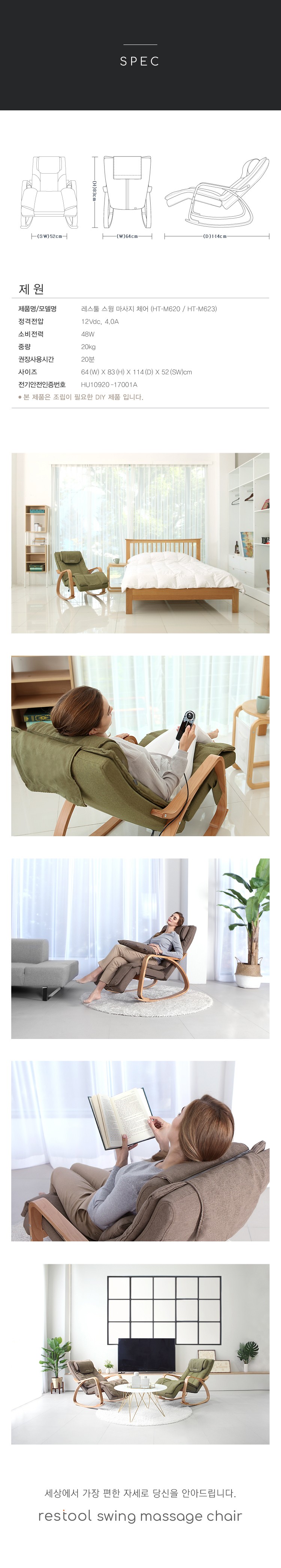 마사지 체어+리클라이닝 체어를 한번에! 헤드필로우 조절도 가능하고 리모컨을 사용해서 온열기능과 마사지 기능으로 집안에서 나만의 힐링존을 즐겨보세요! 평소에는 푹신한 쿠션으로 스윙체어로 쓸수도 있어요!