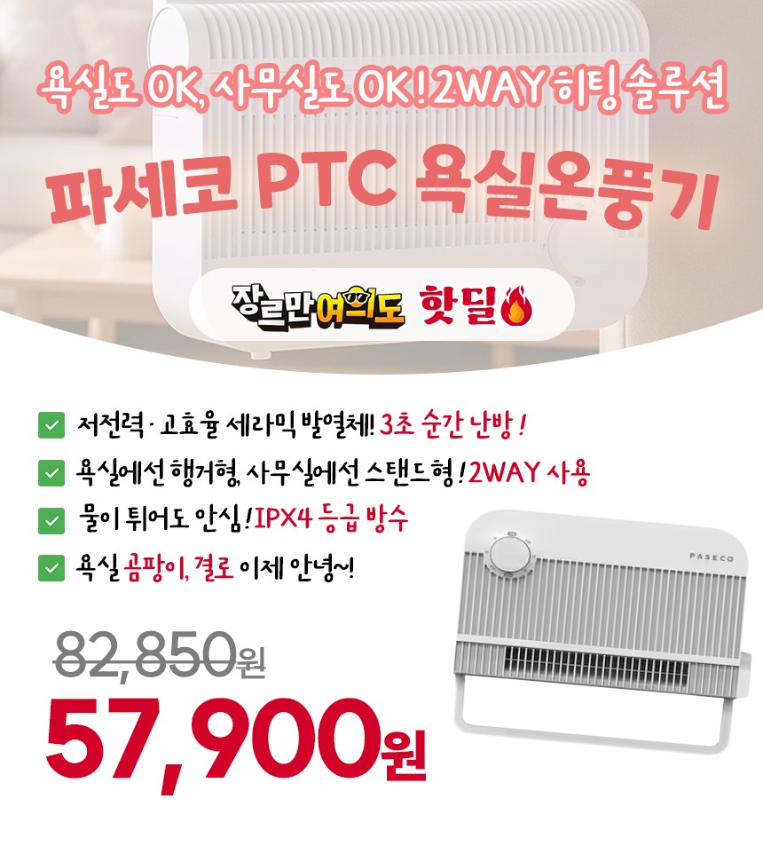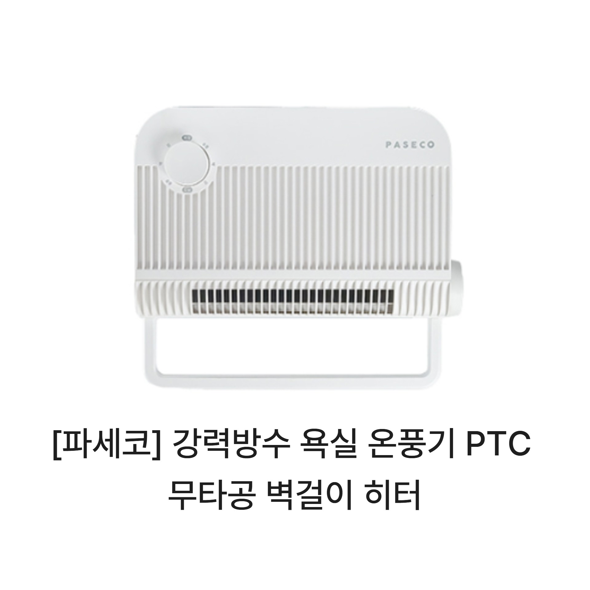 [파세코] 즉시발열 강력방수 욕실 온풍기 PTC 무타공 벽걸이 히터 PHH-SW2000