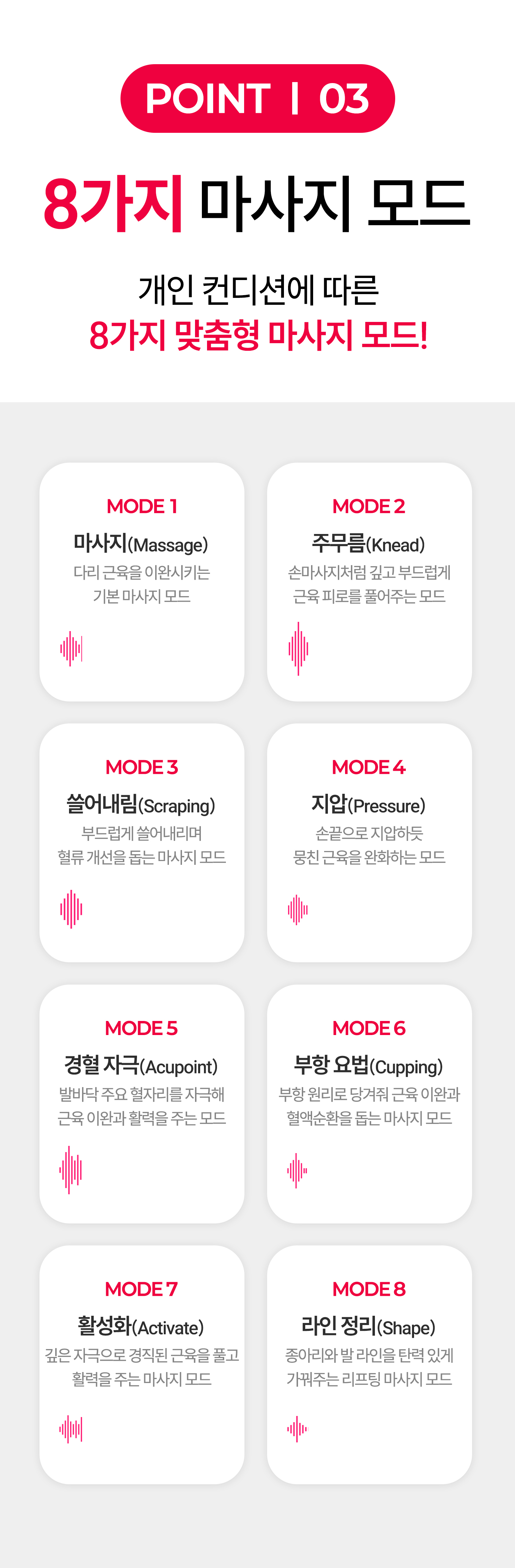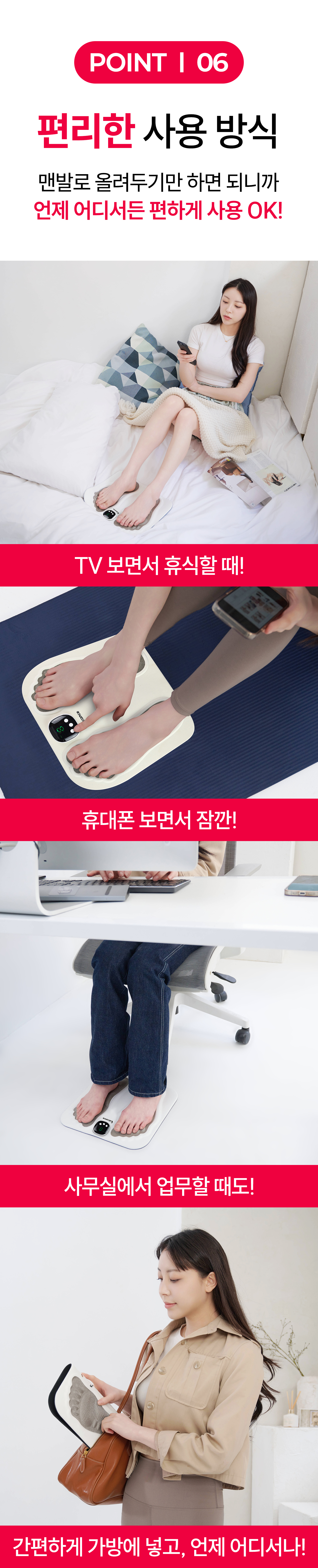 하루 15분으로 지친 피로를 풀어보세요! 3D 입체 마사지패드로 발바닥 모양에 딱! 8가지 맞춤형 마사지모드와 19단계의 강도조절로 나에게 딱 맞는 맞춤케어가 가능해요 :)