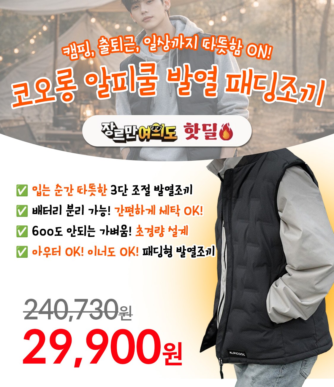 코오롱 직거래를 통해 국내 마지막 물량 뉴퍼마켓 입고되었습니다. 따뜻한 겨울 보내실 수 있도록 고객 감사 특가 준비했습니다. 코오롱 고품질 발열조끼 한정수량이니 빠르게 준비하세요.