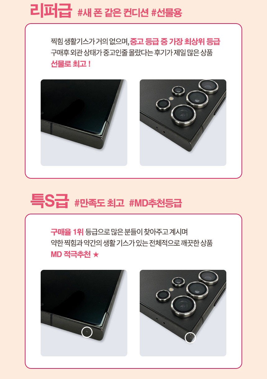 누적 판매 BEST! 실사용 후기가 좋은 제품입니다. 사용 시 눈에 잘 띄지 않는 미세한 흠집이 있을 수 있으나, 전체적으로 깔끔한 상태로 MD가 자신 있게 추천하는 등급입니다.
