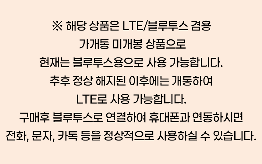 박스미개봉 풀패키지★ 본 제품은 미개봉 LTE 가개통 새제품으로 블루투스용으로 사용이 가능합니다. 추후 정상 해지 된 이후에는 개통하여 사용이 가능한 상품입니다. ★개봉 후에는 교환 및 반품이 불가능합니다.(블루투스 연동 시 전화, 문자, 카톡 등 확인 가능합니다)