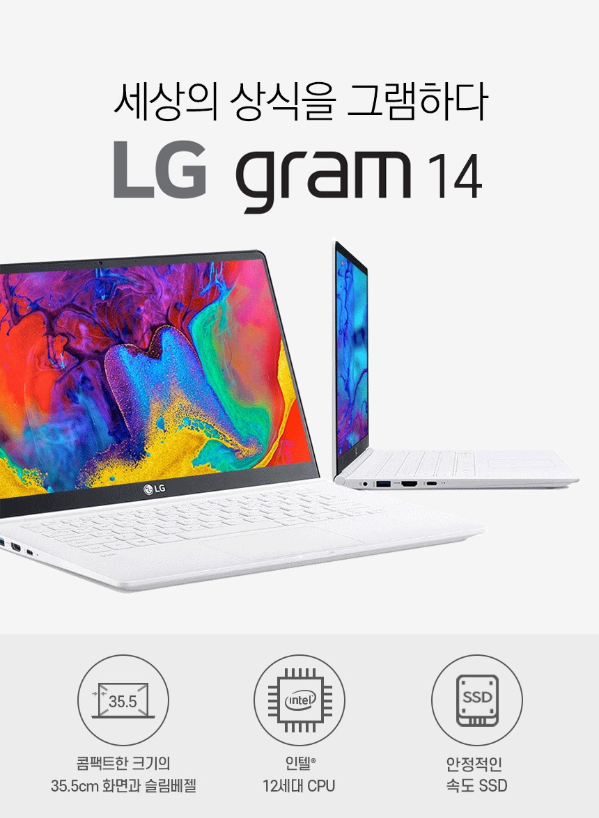 가볍지만 빠르다. 휴대성과 성능을 동시에 잡은 노트북! 999g 미만의 초경량, 언제 어디서나 부담 없이 휴대가능하고 12세대 인텔® Core™ i7 + Windows 11으로 더욱 똑똑하고 빠른 그램14를 지금 바로 구매하세요!!!!