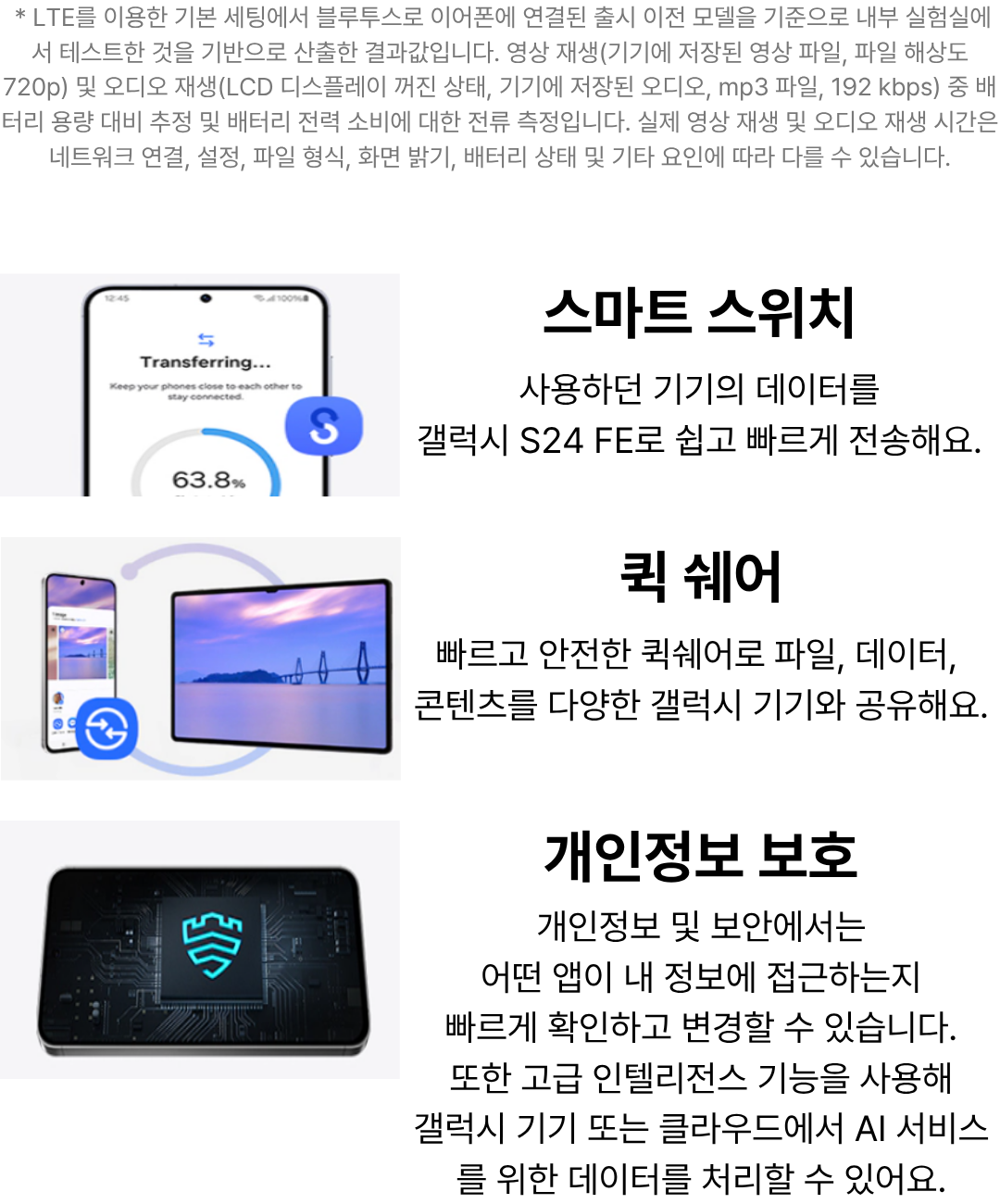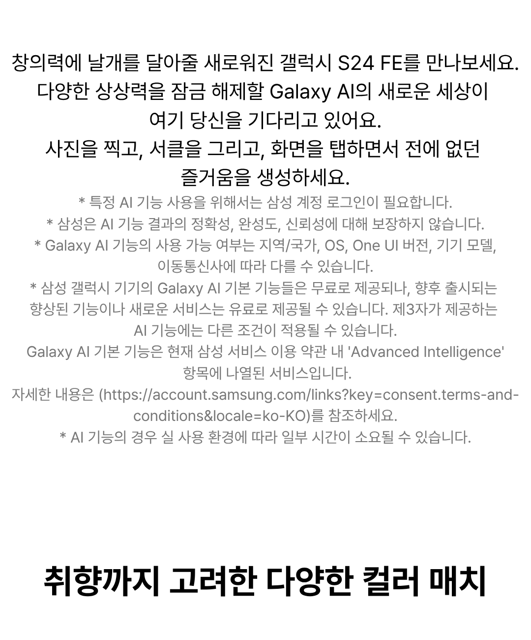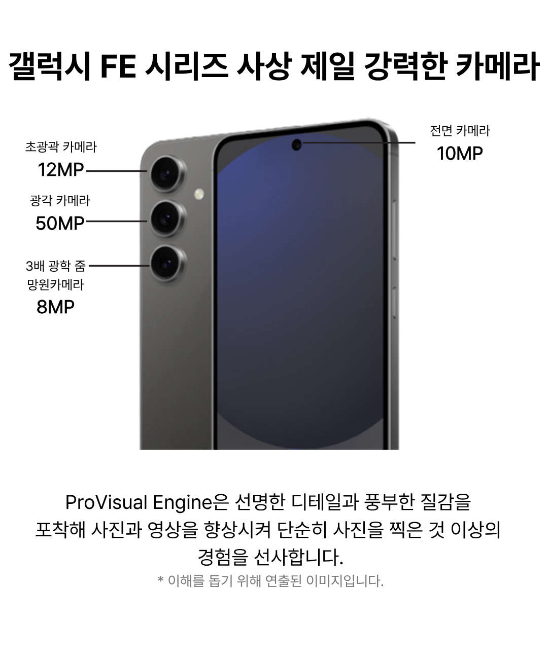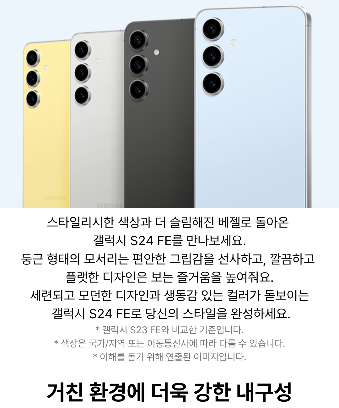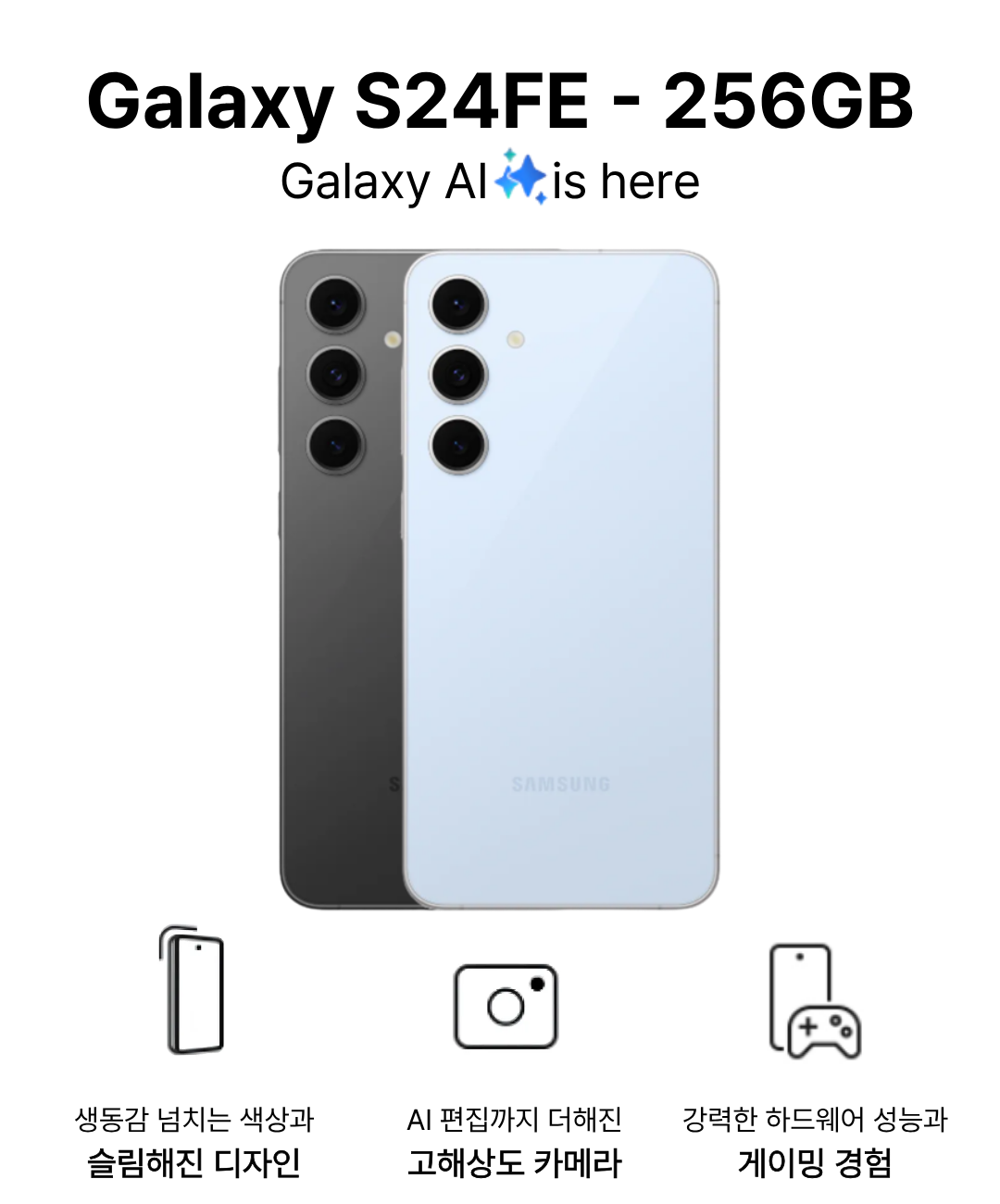 S24 시리즈의 디자인 헤리티지를 계승하면서도 가격 부담 낮춤으로 가성비를 극대화 한 모델로 슈퍼 HDR, 인스턴트 슬로 모션 등으로 일상의 순간을 프로처럼 기록가능하며, 프리미엄 기능을 부담 없이 즐길 수 있는 최고의 선택 갤럭시S24FE입니다. 지금 바로 당신의 일상을 AI로 업그레이드하세요!!!
