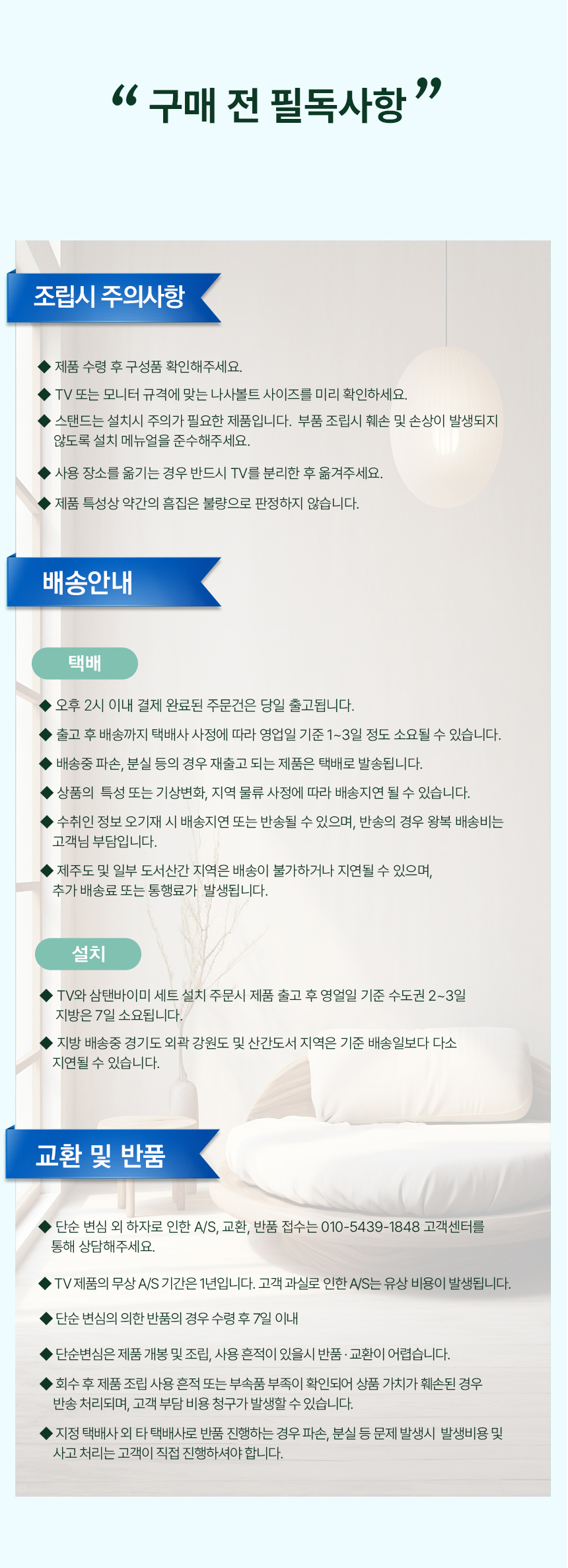 TV벽걸이 설치를 위한 작업완료 이후 제품을 환불할 경우 벽타공의 보상은 지급하지 않습니다.