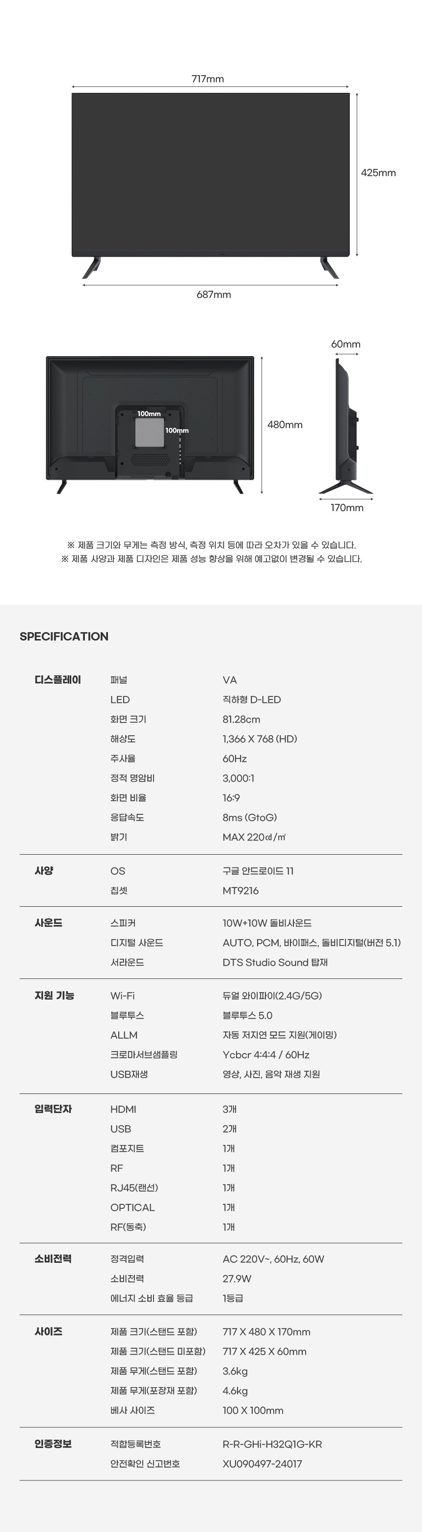 32인치 구글tv 스마트 HD LED 베젤리스 에너지효율1등급