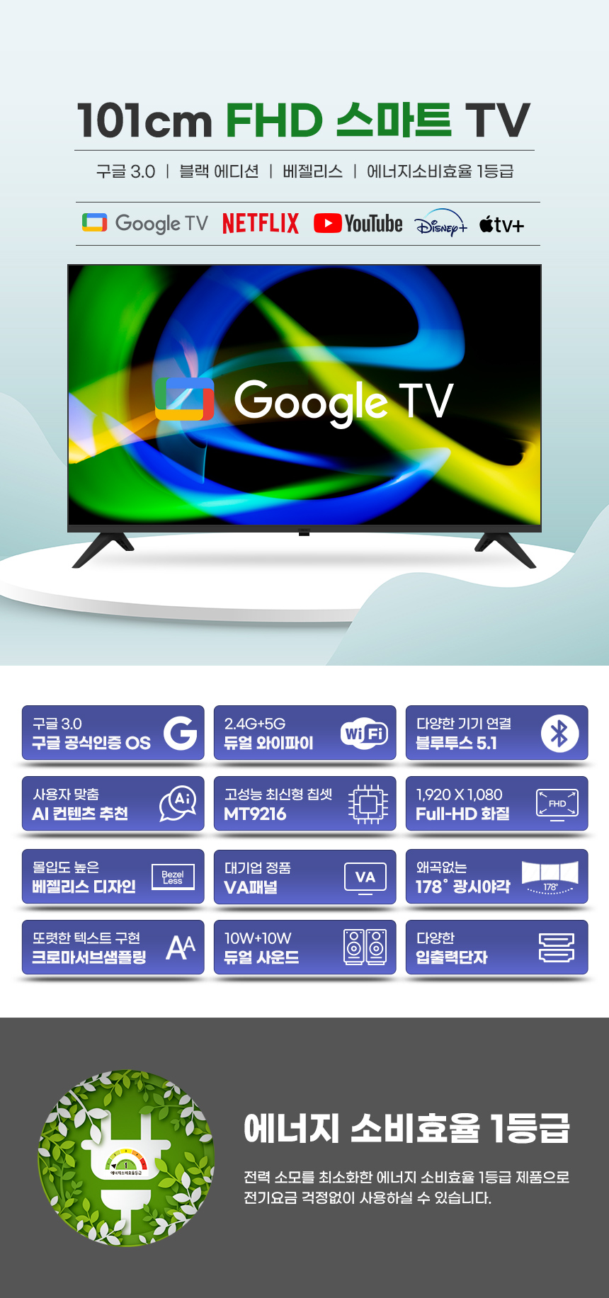 40인치 40FHD 구글 스마트TV 중소기업TV 베젤리스 1등급