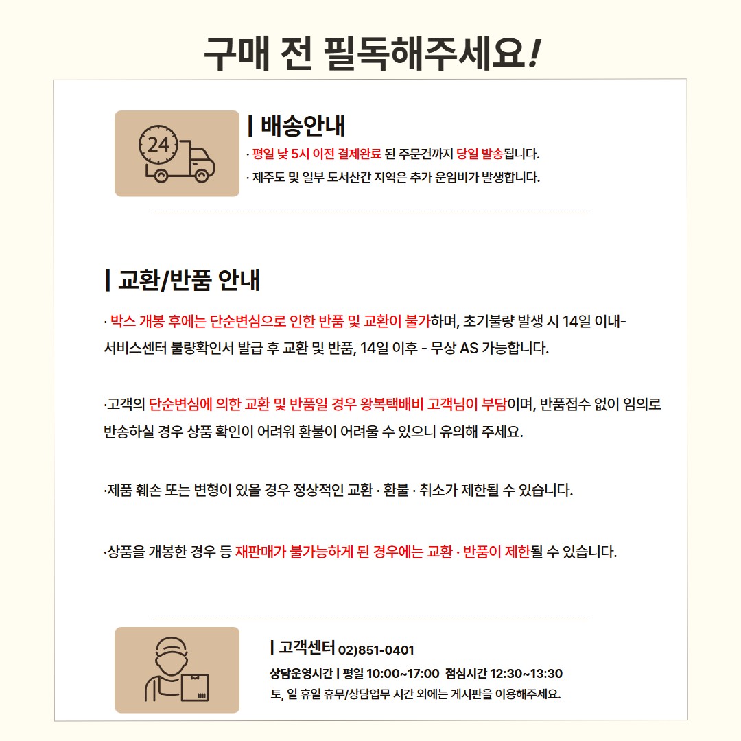 반품, AS, 교환처리시 택배서비스를 이용하여 이루어지고 있습니다. 서비스 이용시 착오없으시기 바랍니다.